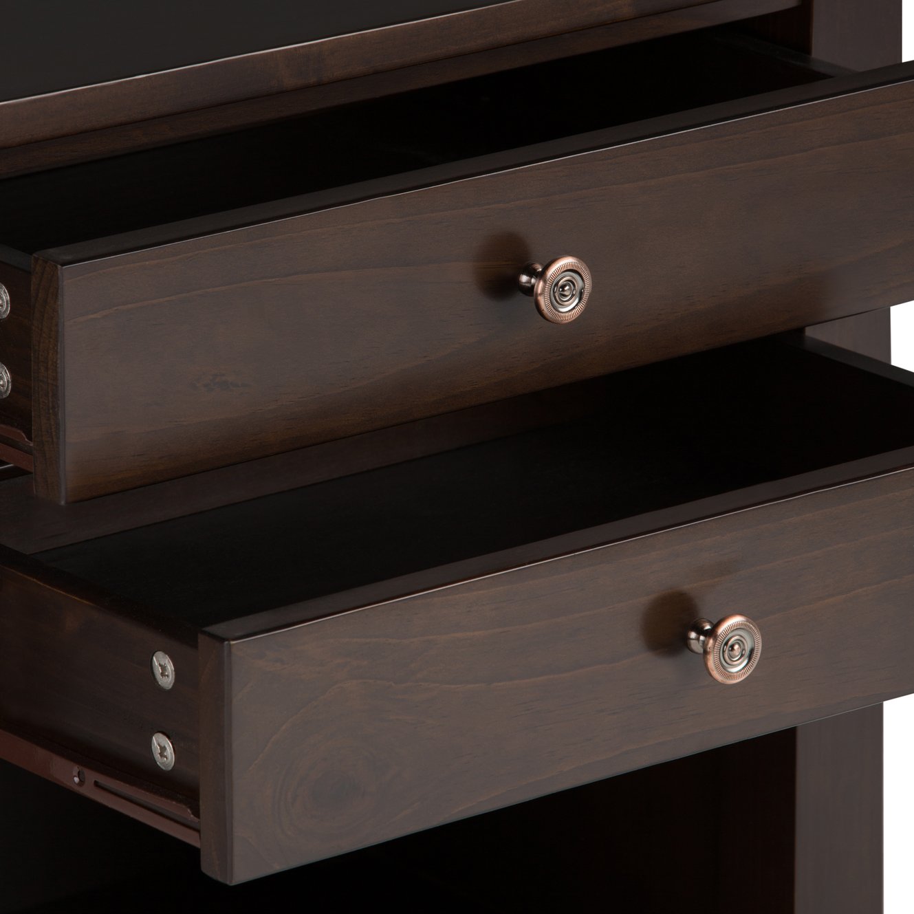 - Design details: Transitional styling with a defined double-molded top, tapered legs, flat-panel drawer fronts, and copper-bronze rounded decorative handles.