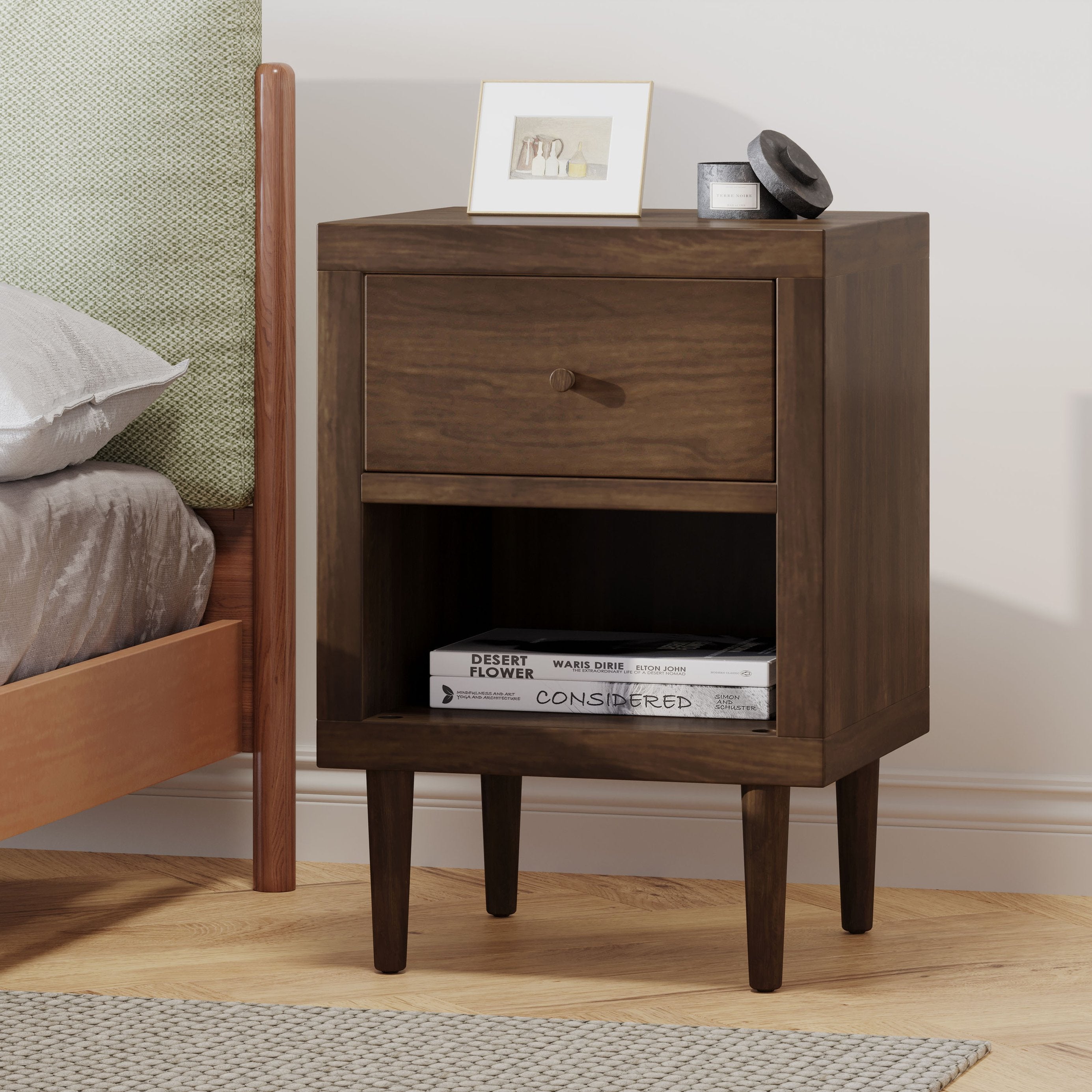 - Storage: One top drawer with a simple wooden knob for easy access, plus an open bottom shelf for books, baskets, or nighttime necessities.