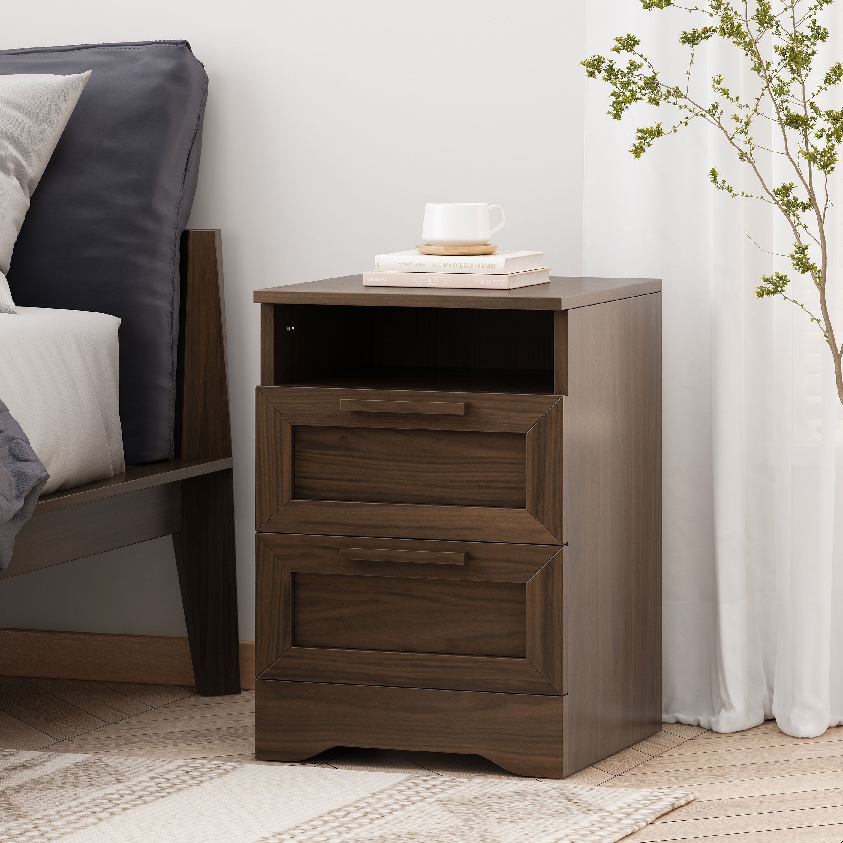 Bring rustic warmth and practical storage to your bedroom with this two-drawer nightstand. Designed in a walnut finish with nature-inspired textures, it pairs the look of real wood with durable MDF construction for a refined, moisture-resistant surface that fits both traditional and modern interiors.