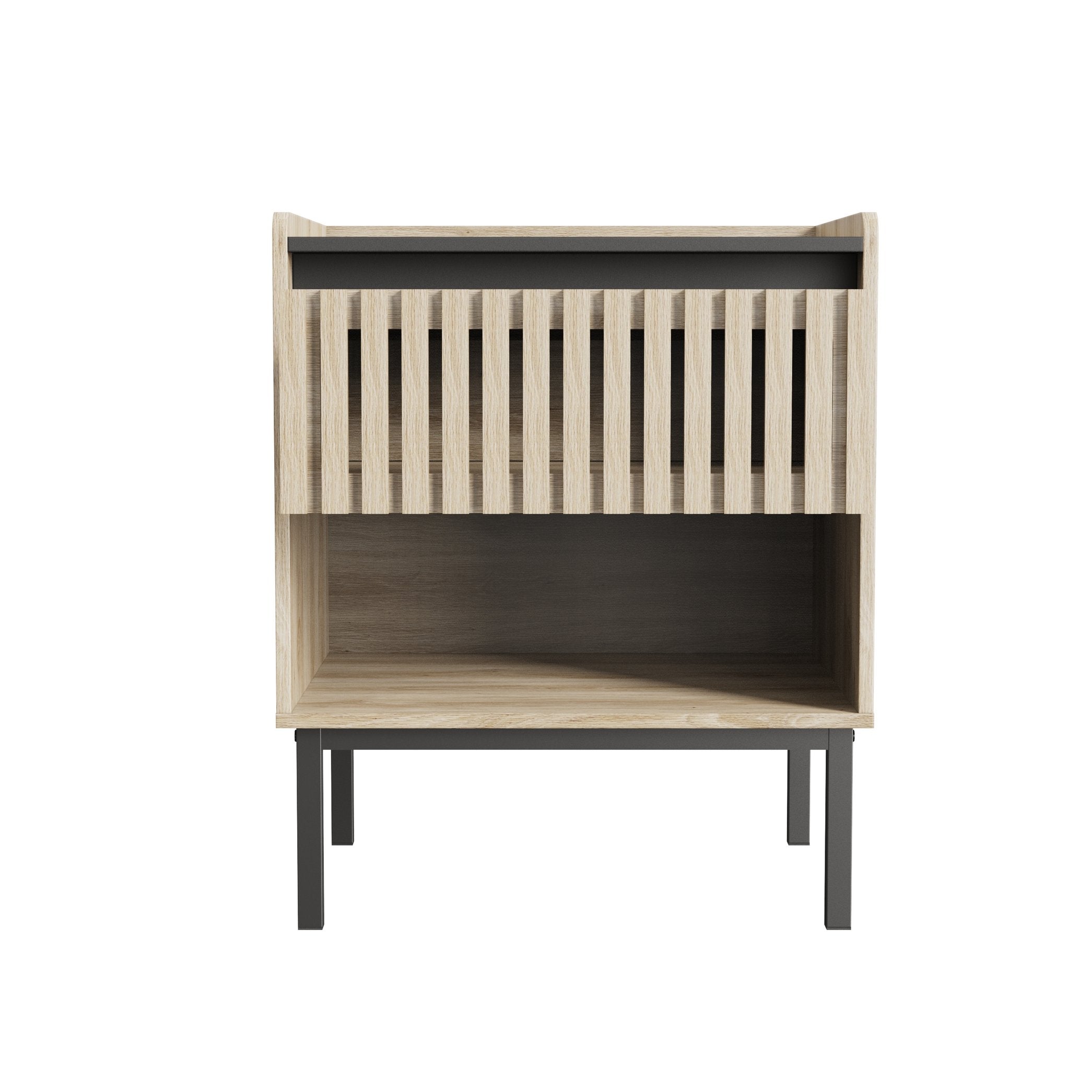 Transform your bedroom with this elegant fluted bedside cabinet set—designed to blend modern minimalism with everyday functionality. Featuring vertical stripe detailing and slim iron feet, the pair delivers streamlined storage and a refined silhouette that complements contemporary and transitional decor. Thoughtfully built for compact spaces, these nightstands keep essentials organized while adding subtle texture and contrast in natural and black finishes.