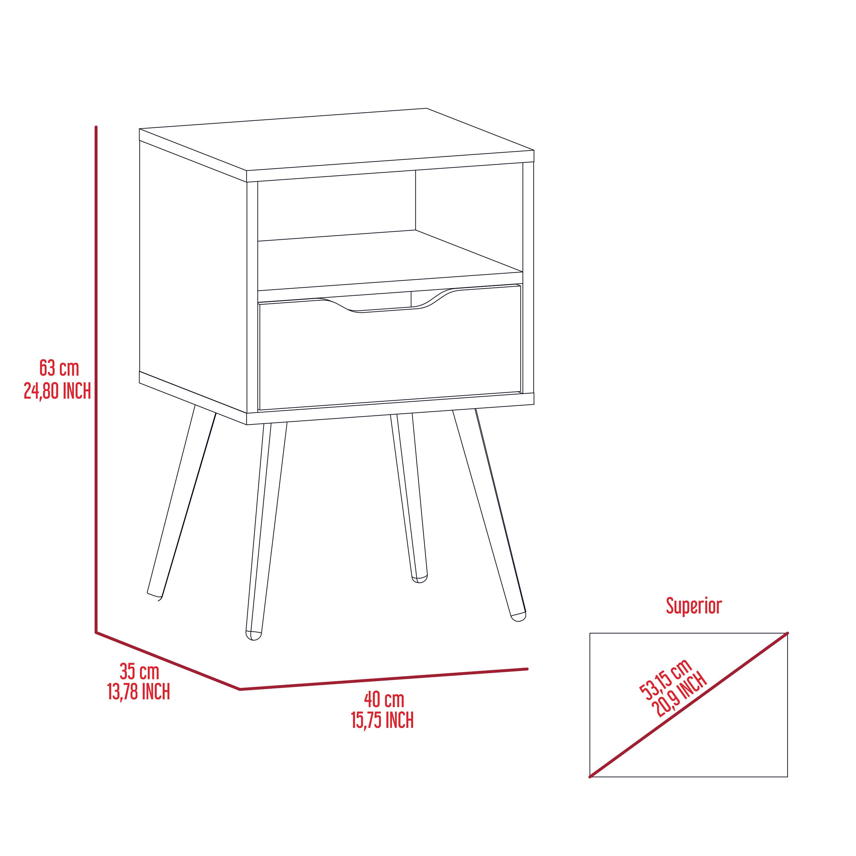 - Storage: One full-extension drawer for small essentials and one open shelf for books, decor, or a glass of water