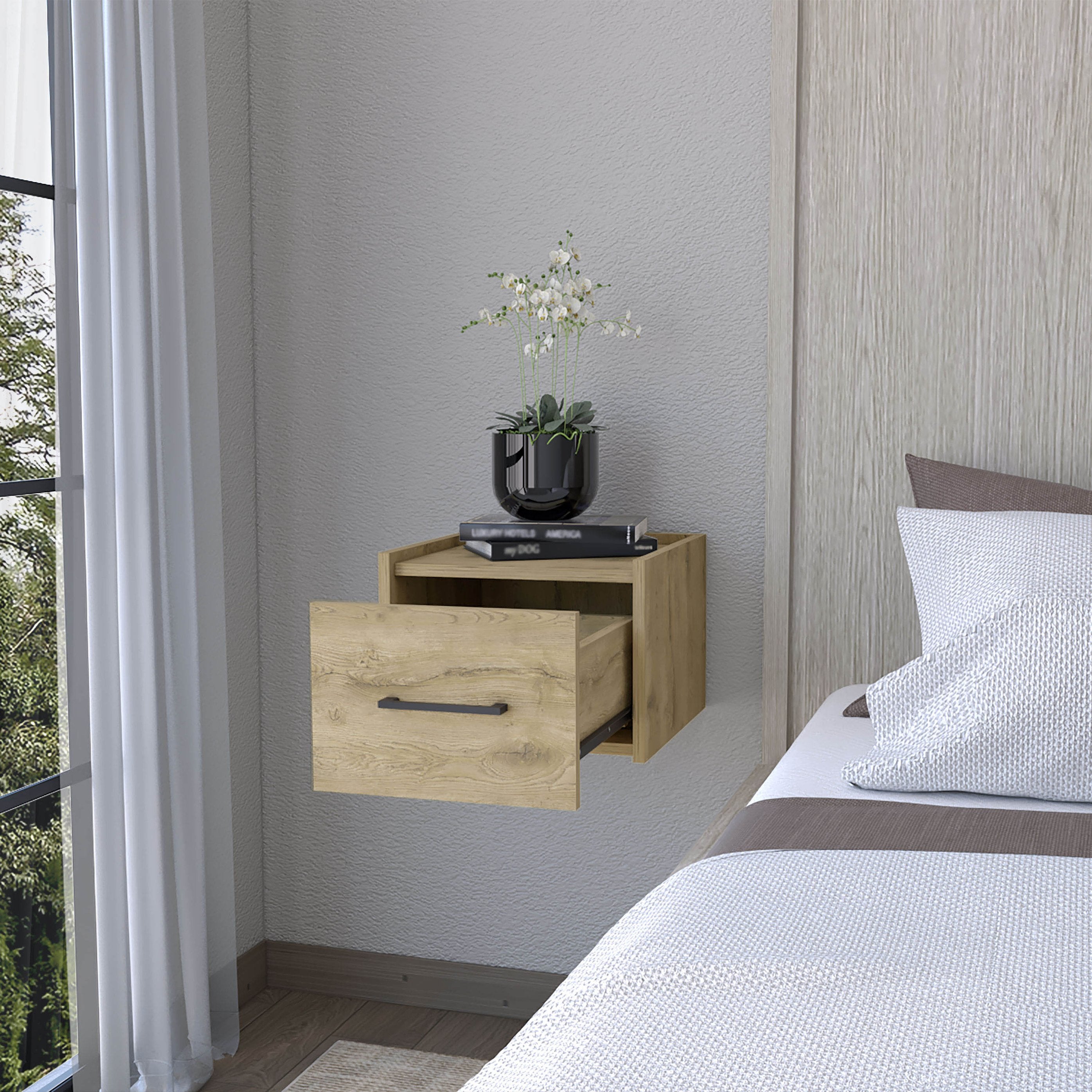 Create a serene, clutter-free bedside area with this wall-mounted floating nightstand. Its streamlined silhouette and warm macadamia finish blend modern minimalism with cozy texture, freeing floor space while keeping essentials within arm’s reach. Ideal for small bedrooms, guest rooms, or anywhere you want a sleek, functional surface without bulky furniture.