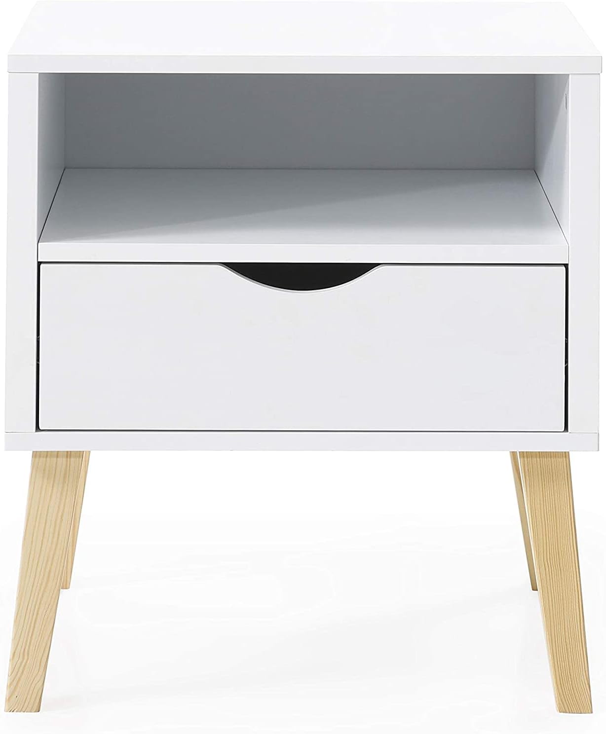 Bring timeless mid-century modern style to your bedroom or living area with this compact Jeff nightstand. Clean white surfaces and natural wood legs offer a versatile, contemporary look while practical storage keeps bedside essentials organized. Ideal for small spaces, it balances form and function with durable hardwood construction and streamlined design.