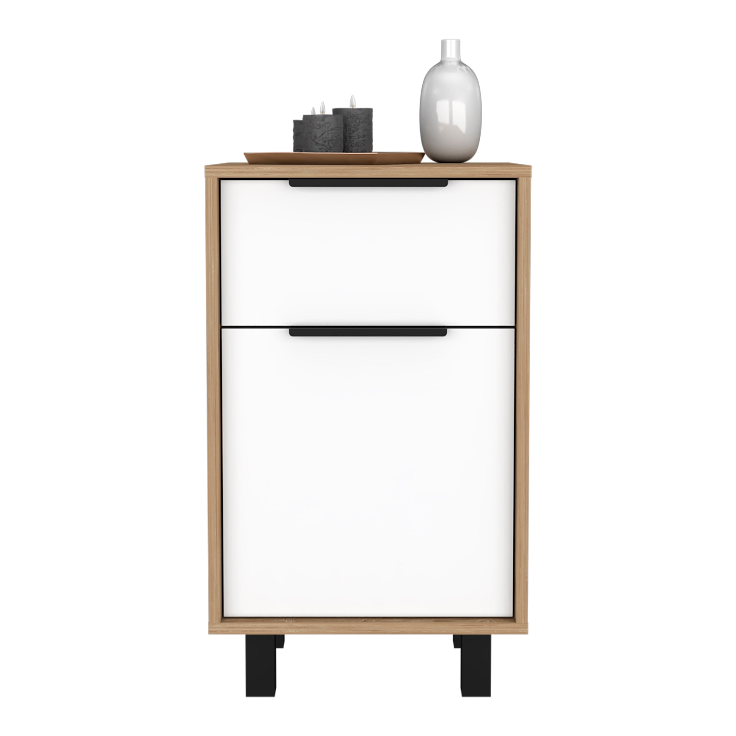 Add warmth and practical storage to your bedroom with this compact pine-and-white nightstand. Thoughtfully designed for everyday use, it pairs a clean-lined silhouette with durable construction to keep essentials organized at arm’s reach. Its neutral finish and classic proportions make it a versatile addition to modern, cottage, or transitional decor.