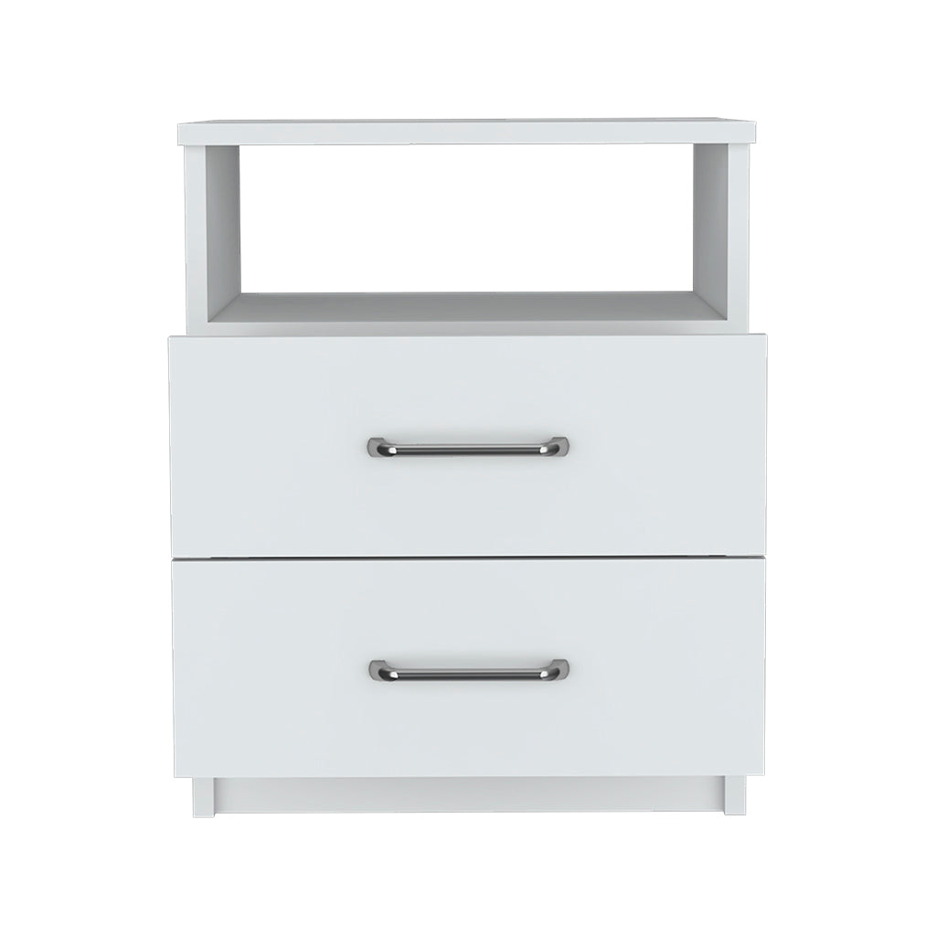 Add contemporary convenience to your bedroom with this clean-lined nightstand, designed for tidy storage and easy access to nightly essentials. Its white finish and simple silhouette blend with modern or minimalist decor while the combination of an open shelf and two drawers keeps chargers, books, and personal items organized and within reach.