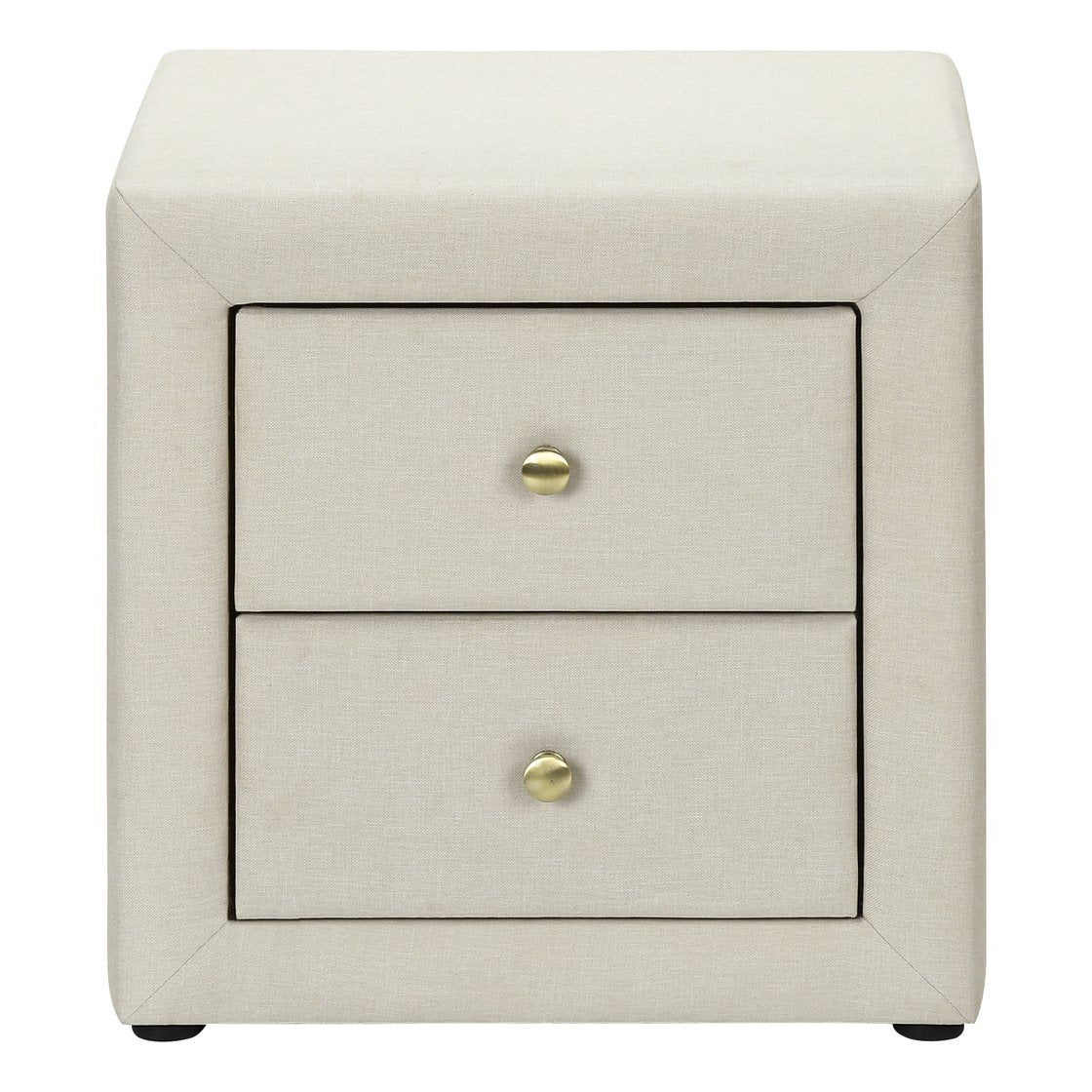 - Upholstered in beige linen-look fabric with a bronze-finished metal drawer knob