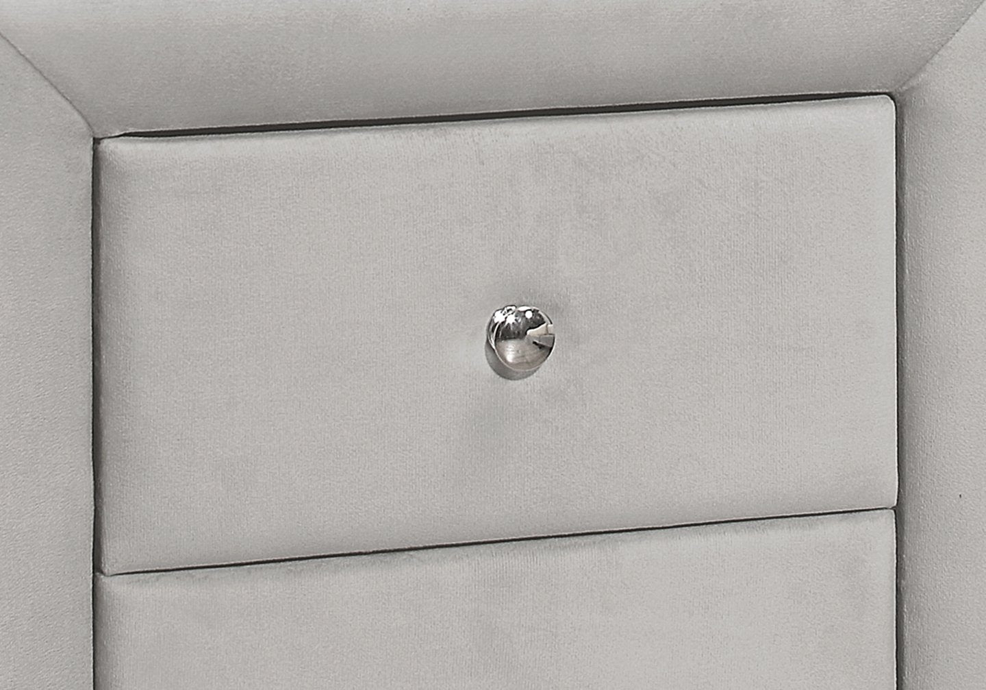 - Upholstered in a rich light grey velvet-look fabric with a chrome-finished metal drawer knob