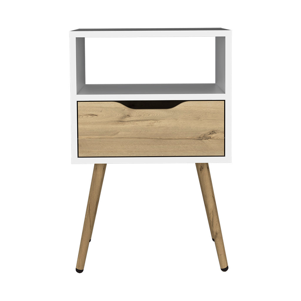 Add a clean, contemporary touch to your bedroom with this compact nightstand that blends white and light oak tones for a fresh, Scandinavian-inspired look. Thoughtfully designed for everyday use, it offers a useful open shelf and a smooth-gliding drawer to keep bedtime essentials organized and within reach—ideal for small spaces or minimalist interiors.