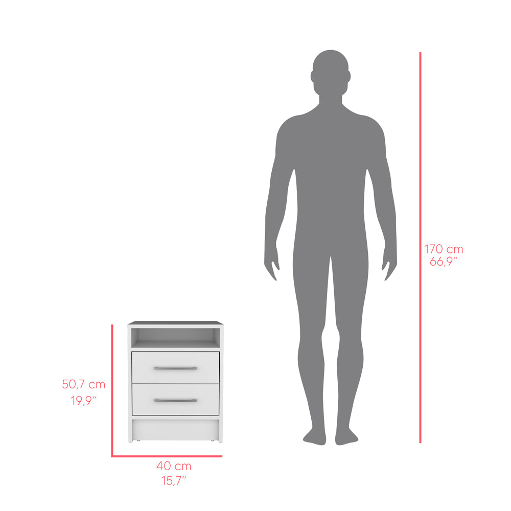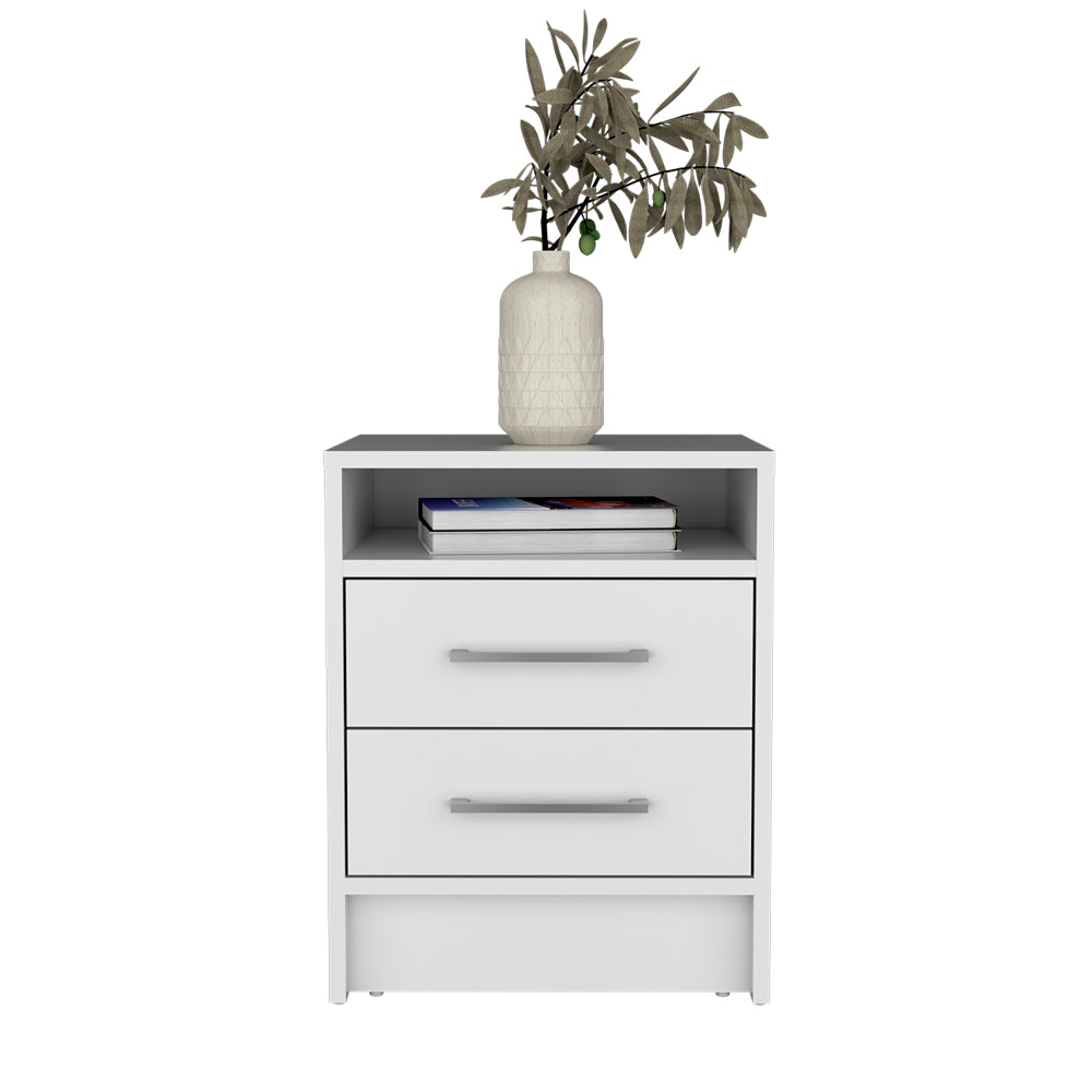Add a clean, modern touch to your bedroom with this compact two-drawer nightstand. Its crisp white finish and simple profile make it easy to coordinate with a variety of décor styles while providing practical storage for bedtime essentials. Designed for everyday use, the piece balances accessible open shelving with concealed drawer space to keep surfaces tidy.