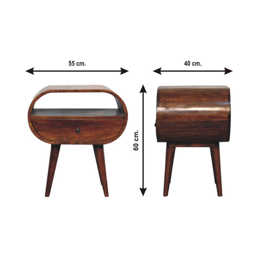 - The bigger brother to IN902, This round style bedside has been constructed from 100% solid mango wood and has one drawer with an open slot, perfect for storing or displaying any bits and pieces before bedtime. It has been constructed from 100% solid mango wood in a chestnut finish allowing its simple design to be able to be partnered with any styles or finishes of furniture.
