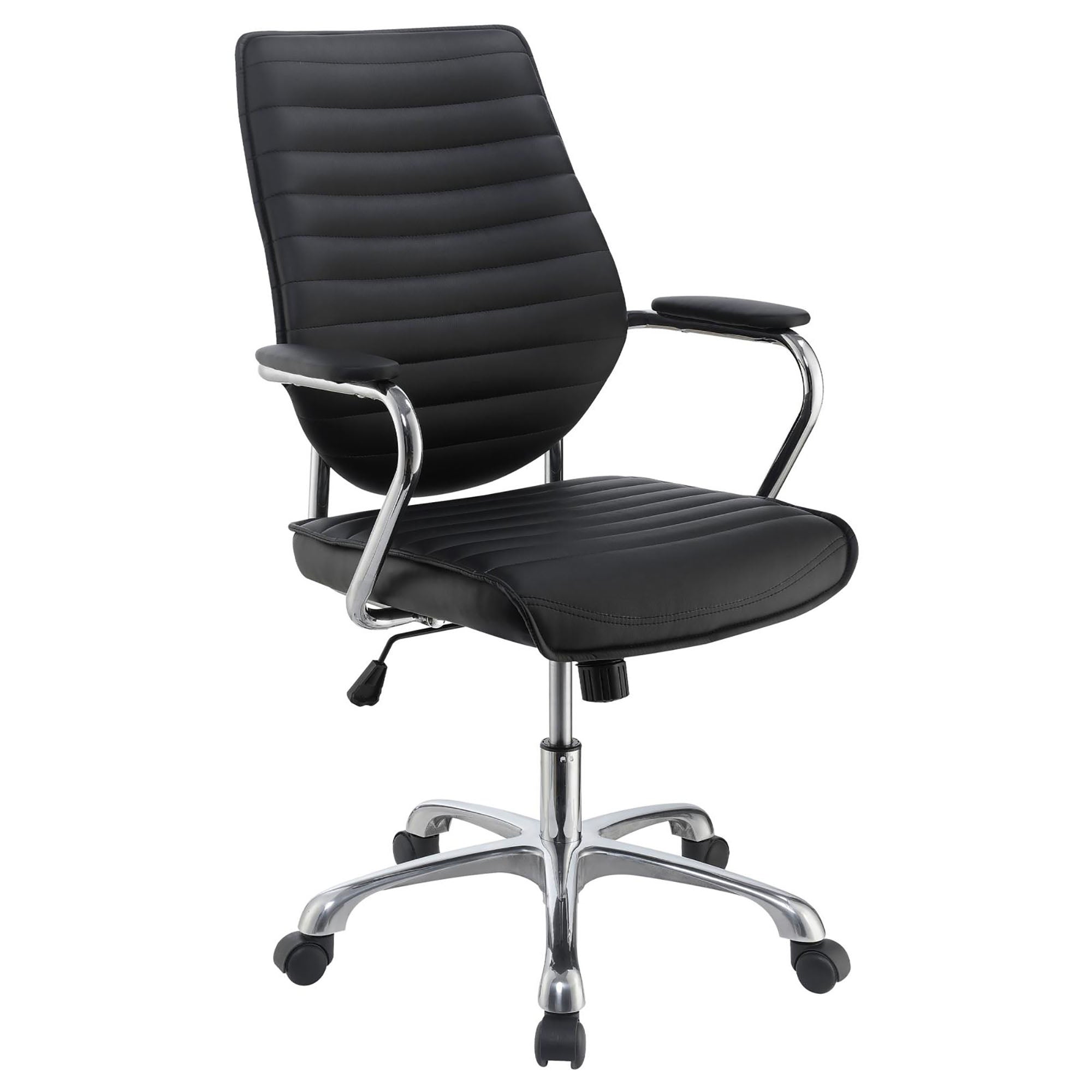 Upgrade your workspace with a sleek, contemporary office chair that pairs bold chrome accents with a sophisticated black leatherette finish. Designed for both style and comfort, this swivel chair offers adjustable height and tilt control to support productive work sessions and relaxed breaks alike.