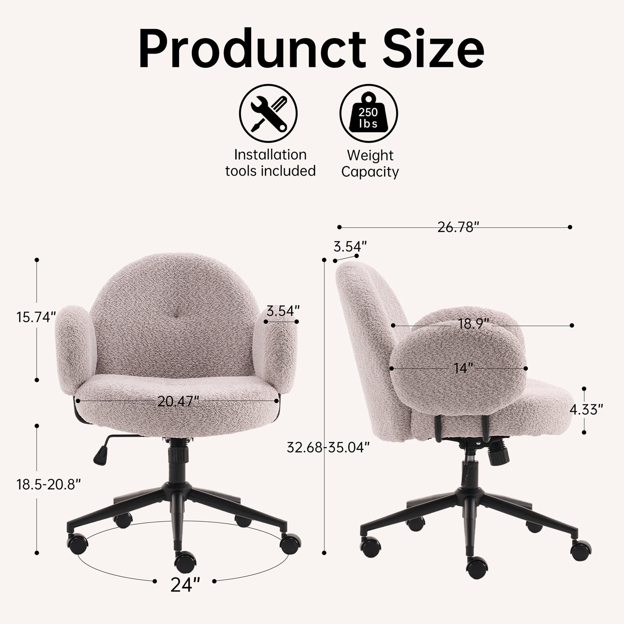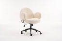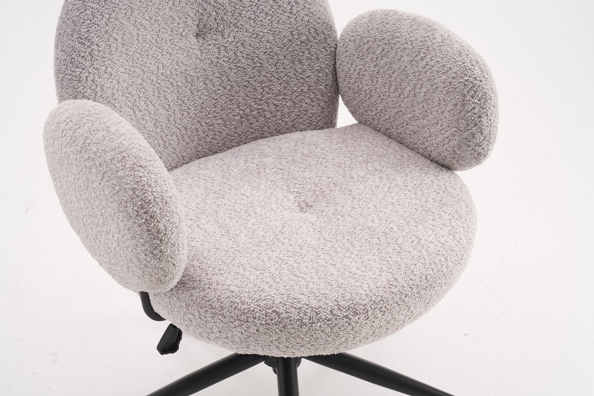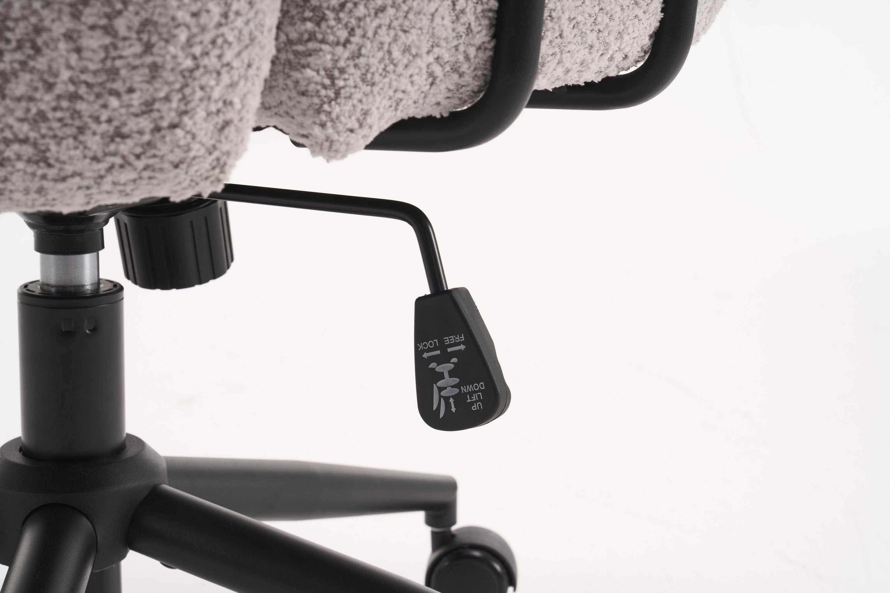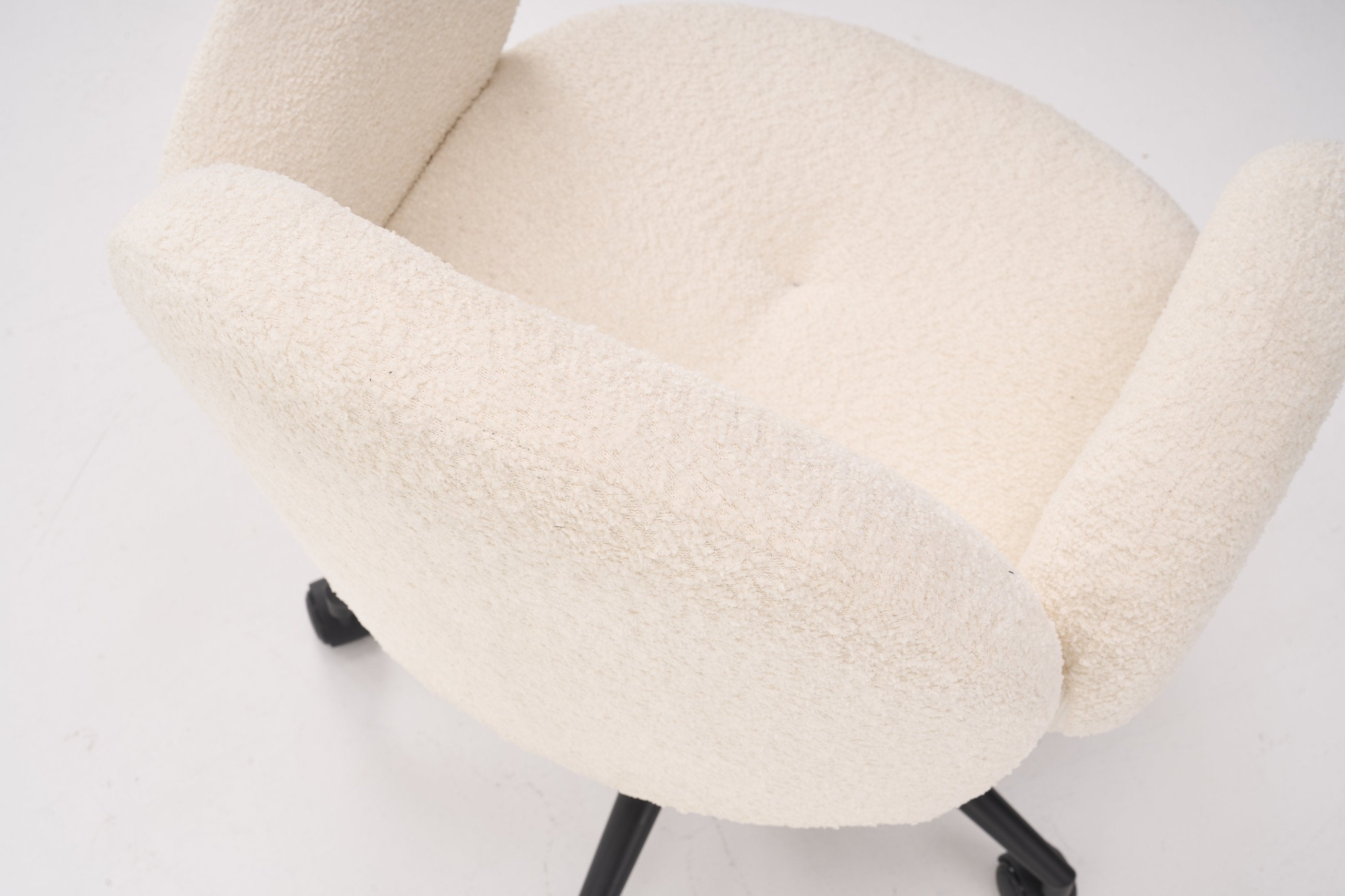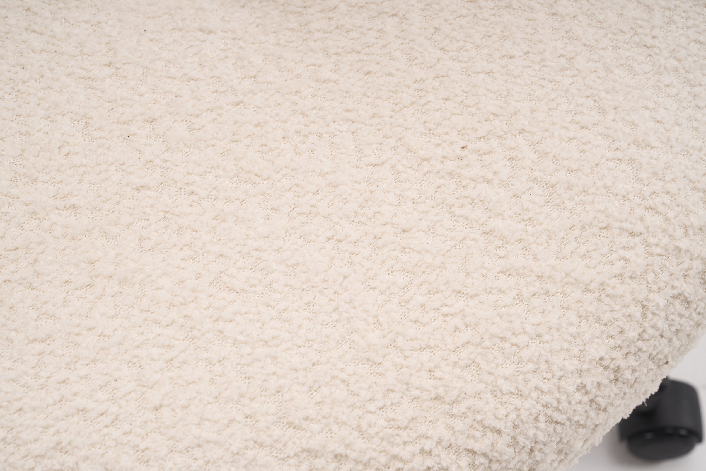 Elevate your workspace with a stylish and comfortable boucle fabric task chair that blends modern design with ergonomic support. Wrapped in soft boucle upholstery and built on a sturdy black metal base, this chair offers smooth 360° swivel motion, reliable mobility on five dual-wheel casters, and height adjustability to suit a variety of desks and seating preferences — ideal for home offices, studies, or vanity areas.