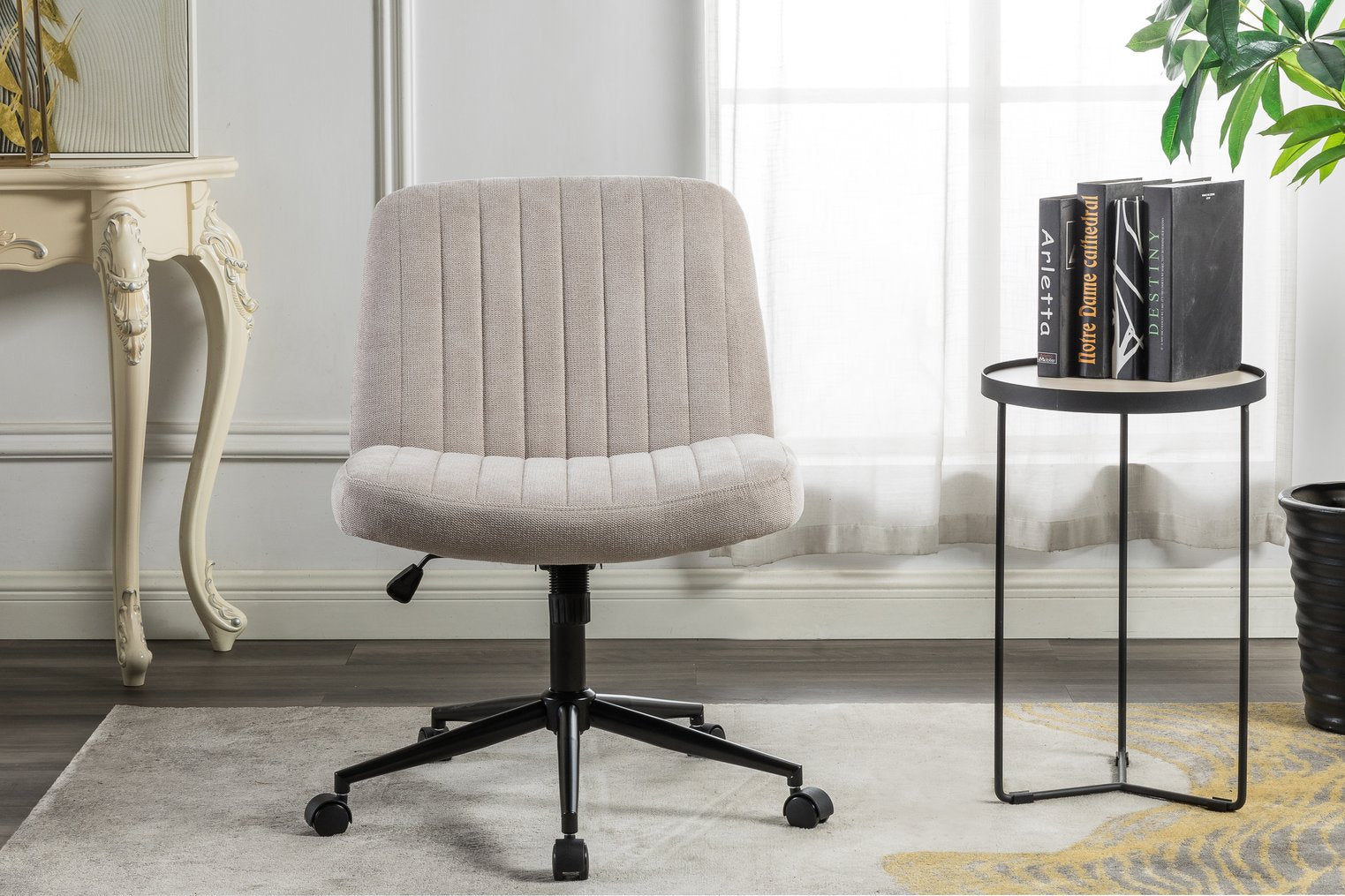 Sink into modern comfort with this wide, armless office chair designed for relaxed work, makeup routines, or casual computer use. Its channel-tufted fabric, high-density foam cushion, and ergonomic contours support cross-legged sitting and long sessions, while smooth swivel, tilt, and height adjustments let you find the perfect position quickly. Slim, minimalist styling makes it a versatile addition to home offices, vanity areas, and studio spaces.
