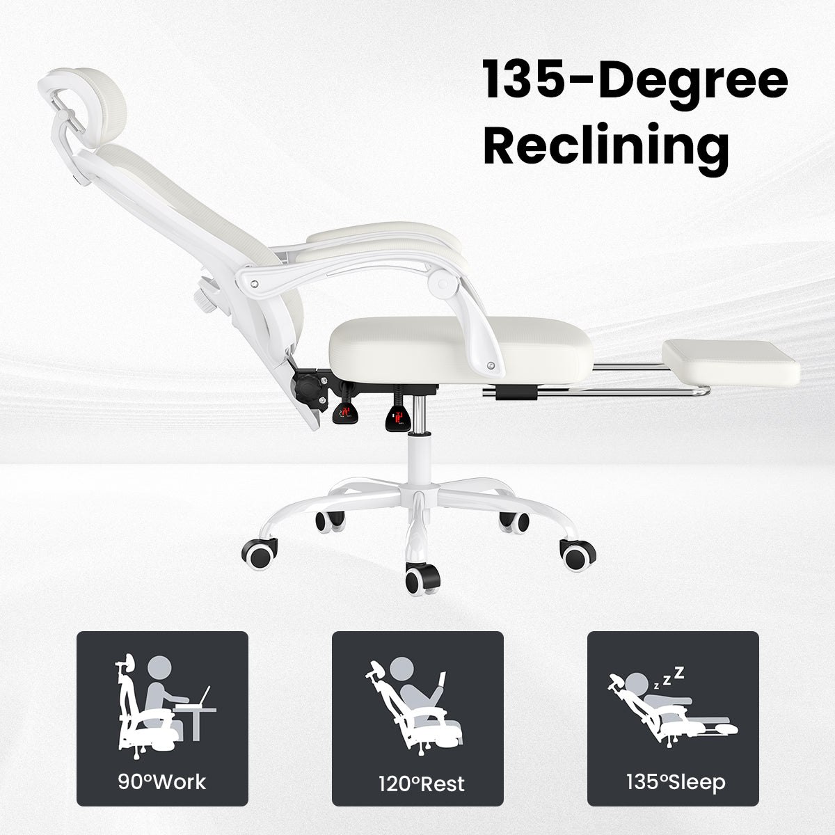 - MESH HIGH BACK & RECLING - This computer desk chair back can be adjusted from 90 to 135 for your comfort, you can lock in any angle you want. Meanwhile 360 swivel wheels can be moved freely, the high back and headrest are both made of mesh,This ergonomic office chair is super breathable and giving you high resilience support
