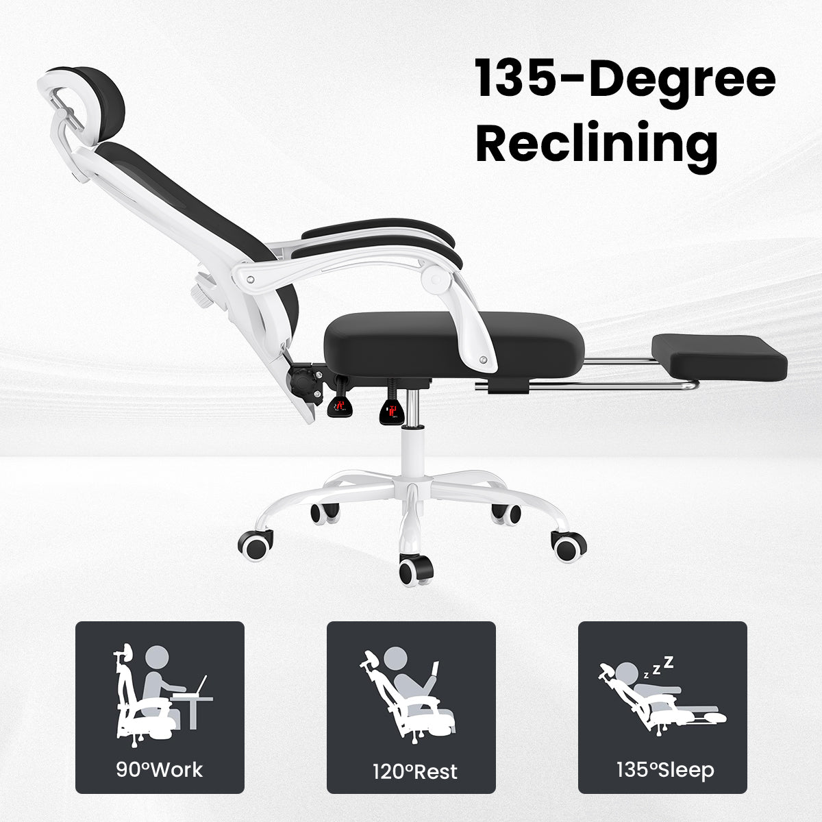 - MESH HIGH BACK & RECLING - This computer desk chair back can be adjusted from 90 to 135 for your comfort, you can lock in any angle you want. Meanwhile 360 swivel wheels can be moved freely, the high back and headrest are both made of mesh,This ergonomic office chair is super breathable and giving you high resilience support