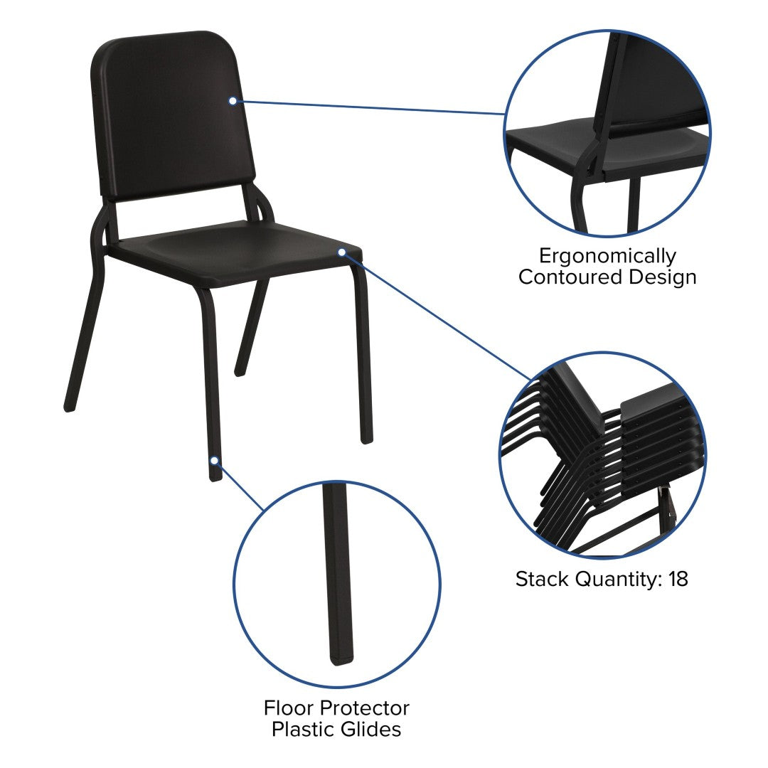 - Stackable for storage: Stacks up to 18 chairs high for efficient storage and quick setup/takedown.