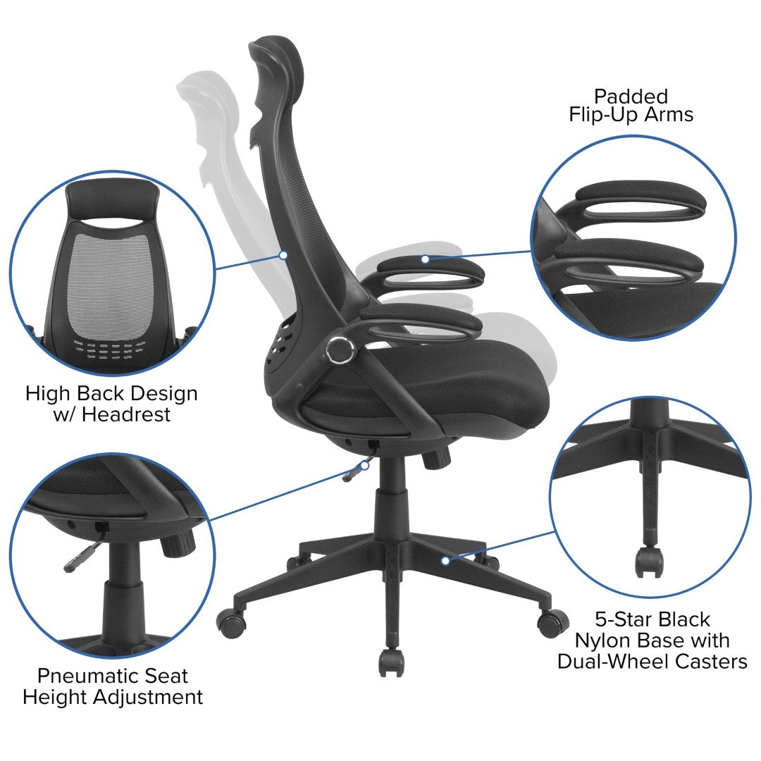 Upgrade your workspace with a sleek, ergonomic executive chair designed to blend modern styling with all-day comfort. The contoured high-back mesh supports your upper spine and promotes airflow to keep you cool, while a padded waterfall seat and adjustable features reduce pressure and encourage better posture during long work sessions. Flip-up arms add versatility for desk or task use, and durable construction ensures reliable performance in home or professional settings.