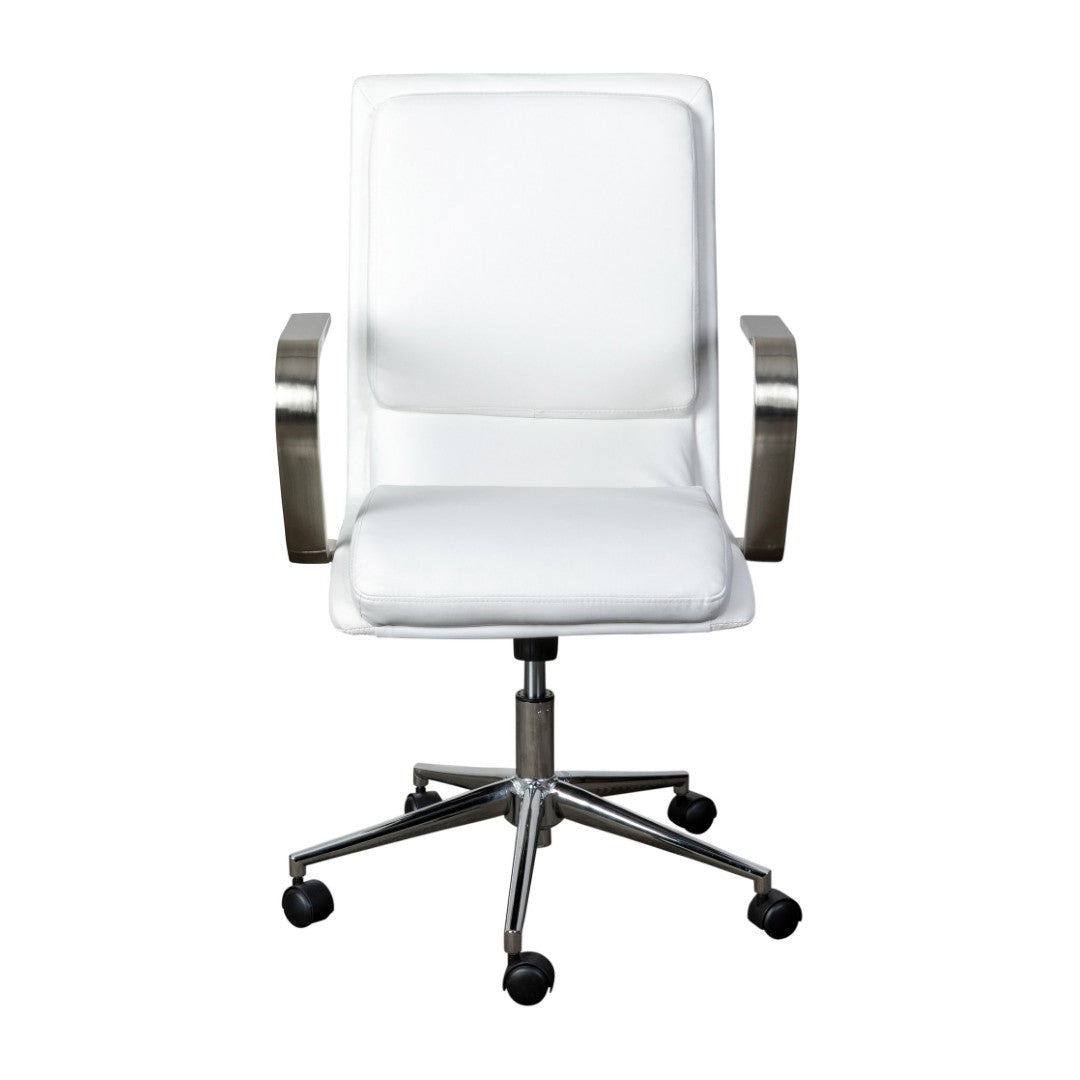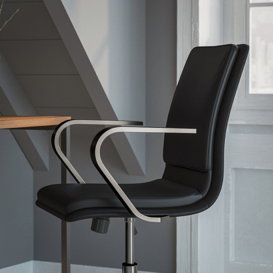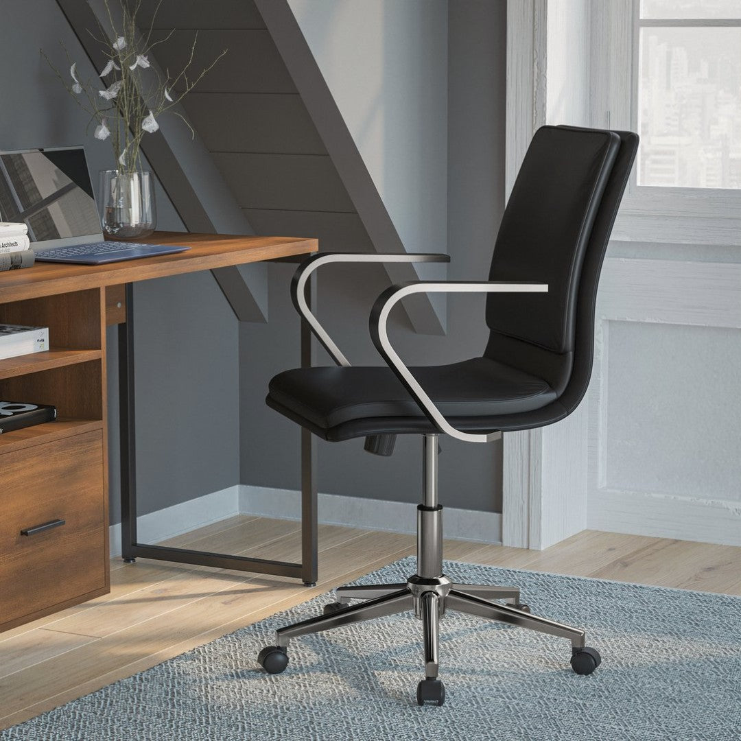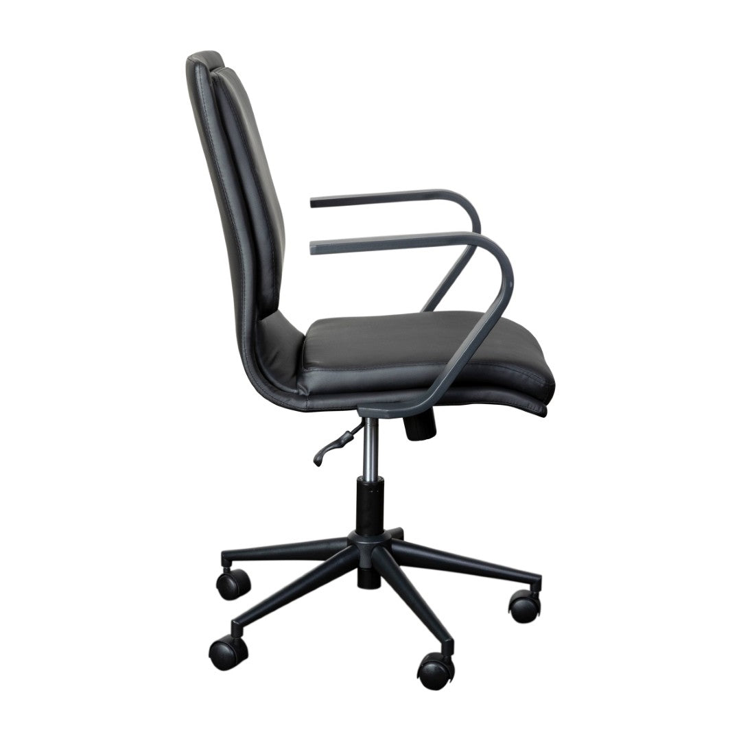 Bring refined style and all-day comfort to your home or office with this mid-back executive chair. Upholstered in durable LeatherSoft for a sleek, professional look, the chair pairs plush foam padding and ergonomic detailing—like a waterfall seat edge and curved supportive arms—to reduce pressure and promote better circulation during long work sessions. Smooth pneumatic height adjustment, tilt-lock tension, and 360° swivel let you personalize your seating experience, while dual-wheel casters and a sturdy 5-star base provide stable, easy mobility.