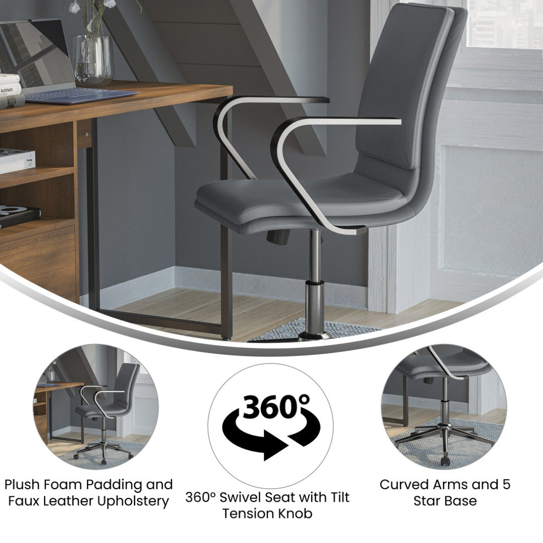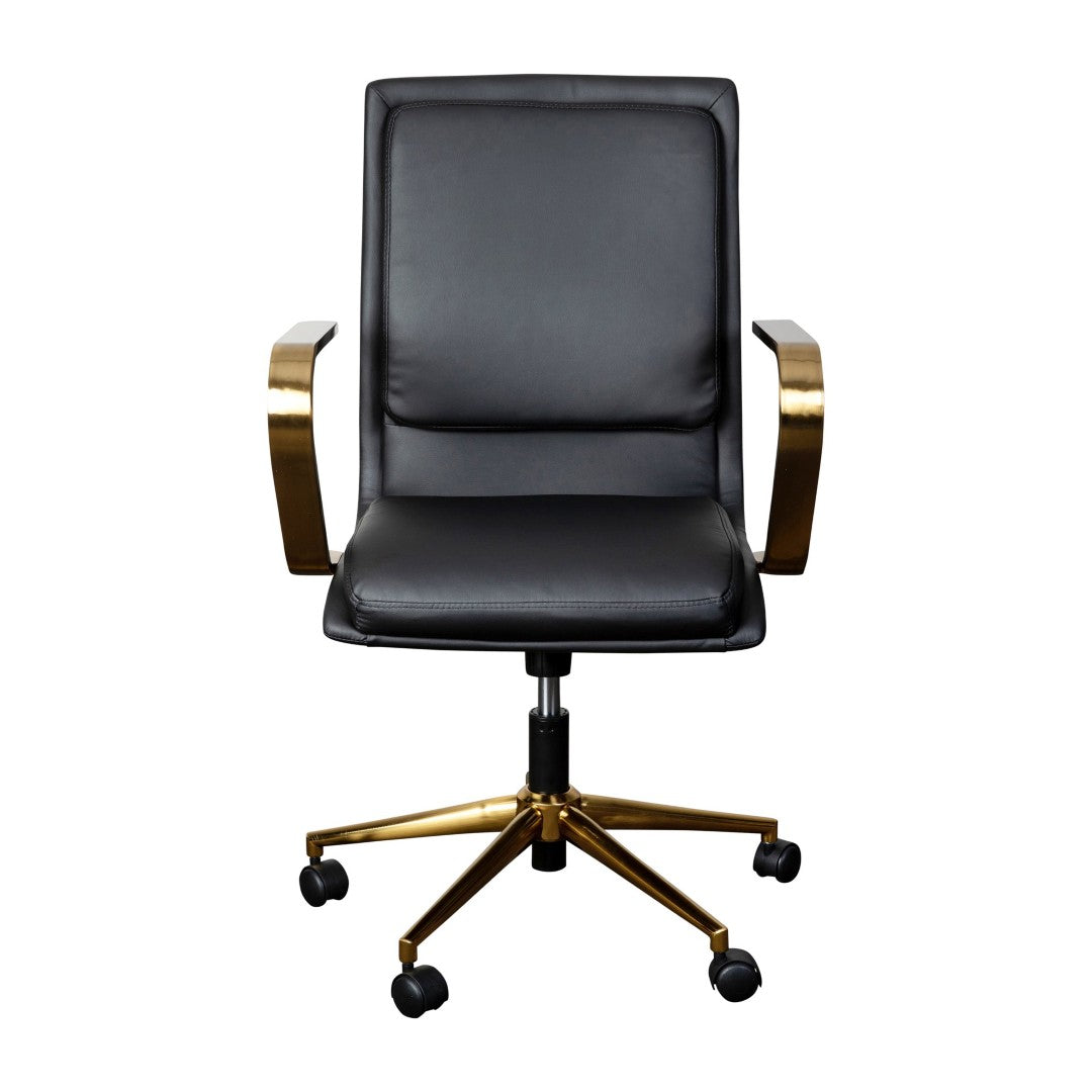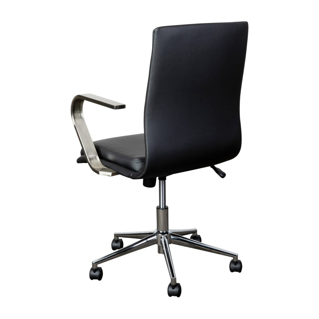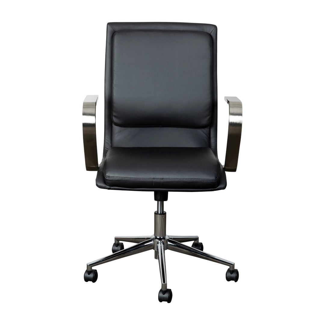 Bring refined style and all-day comfort to your home or office with this mid-back executive chair. Upholstered in durable LeatherSoft for a sleek, professional look, the chair pairs plush foam padding and ergonomic detailing—like a waterfall seat edge and curved supportive arms—to reduce pressure and promote better circulation during long work sessions. Smooth pneumatic height adjustment, tilt-lock tension, and 360° swivel let you personalize your seating experience, while dual-wheel casters and a sturdy 5-star base provide stable, easy mobility.