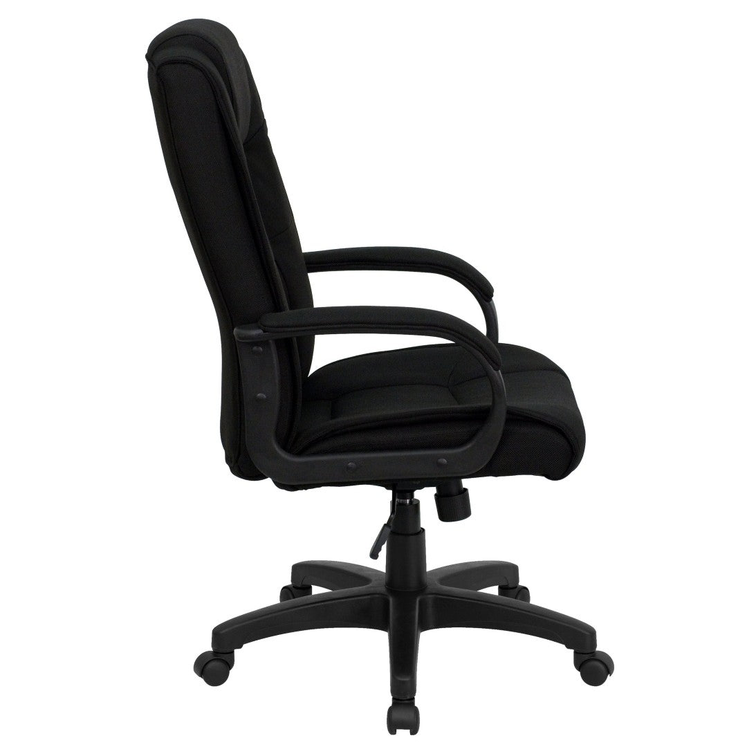 Experience all-day comfort and professional style with this high-back executive swivel chair—designed to support long hours at the desk while enhancing any office or home workspace. Upholstered in durable black fabric and built with ergonomics in mind, the chair combines lumbar support, a contoured seat and back, and adjustable tilt and height functions so you can stay focused and comfortable from morning meetings to late-night tasks.