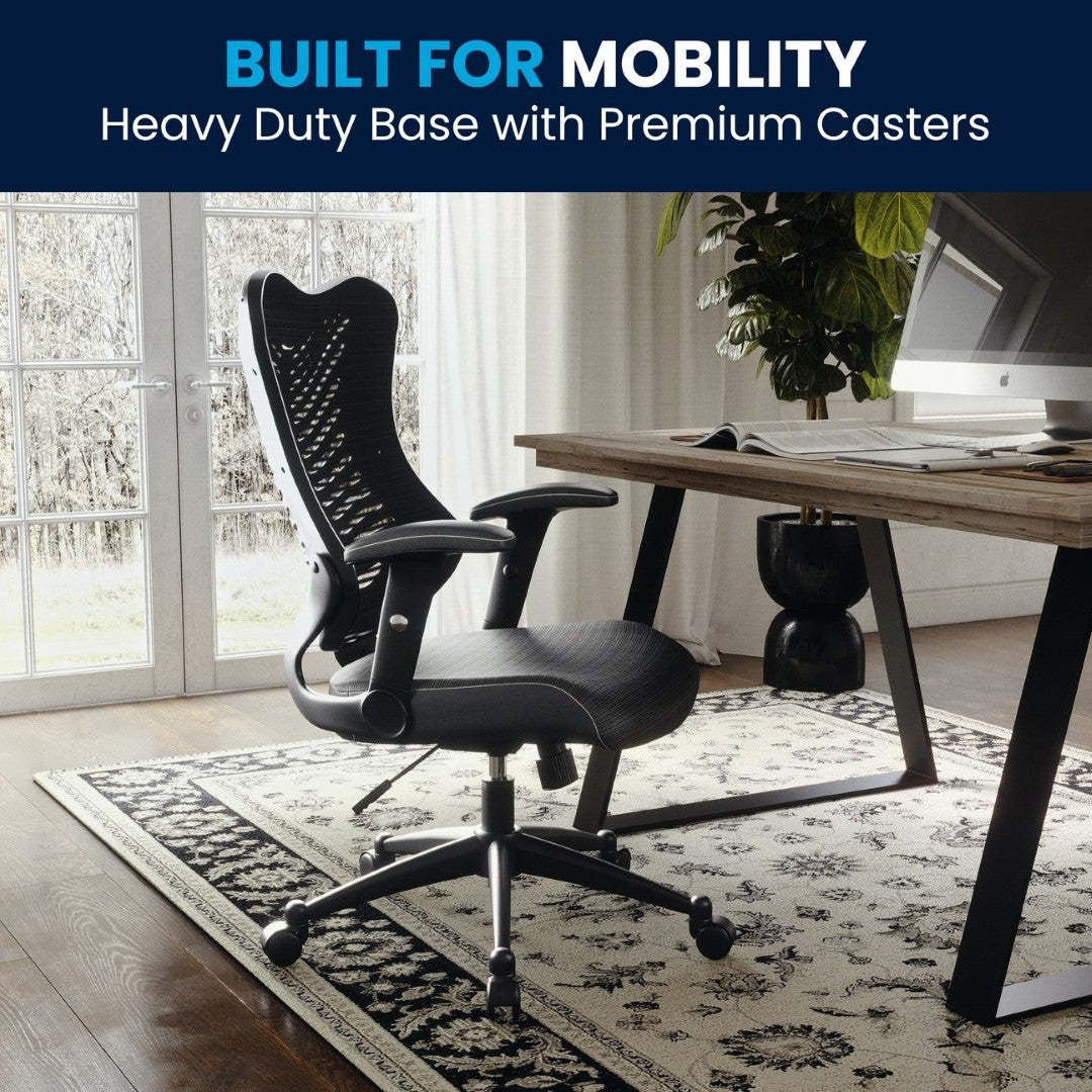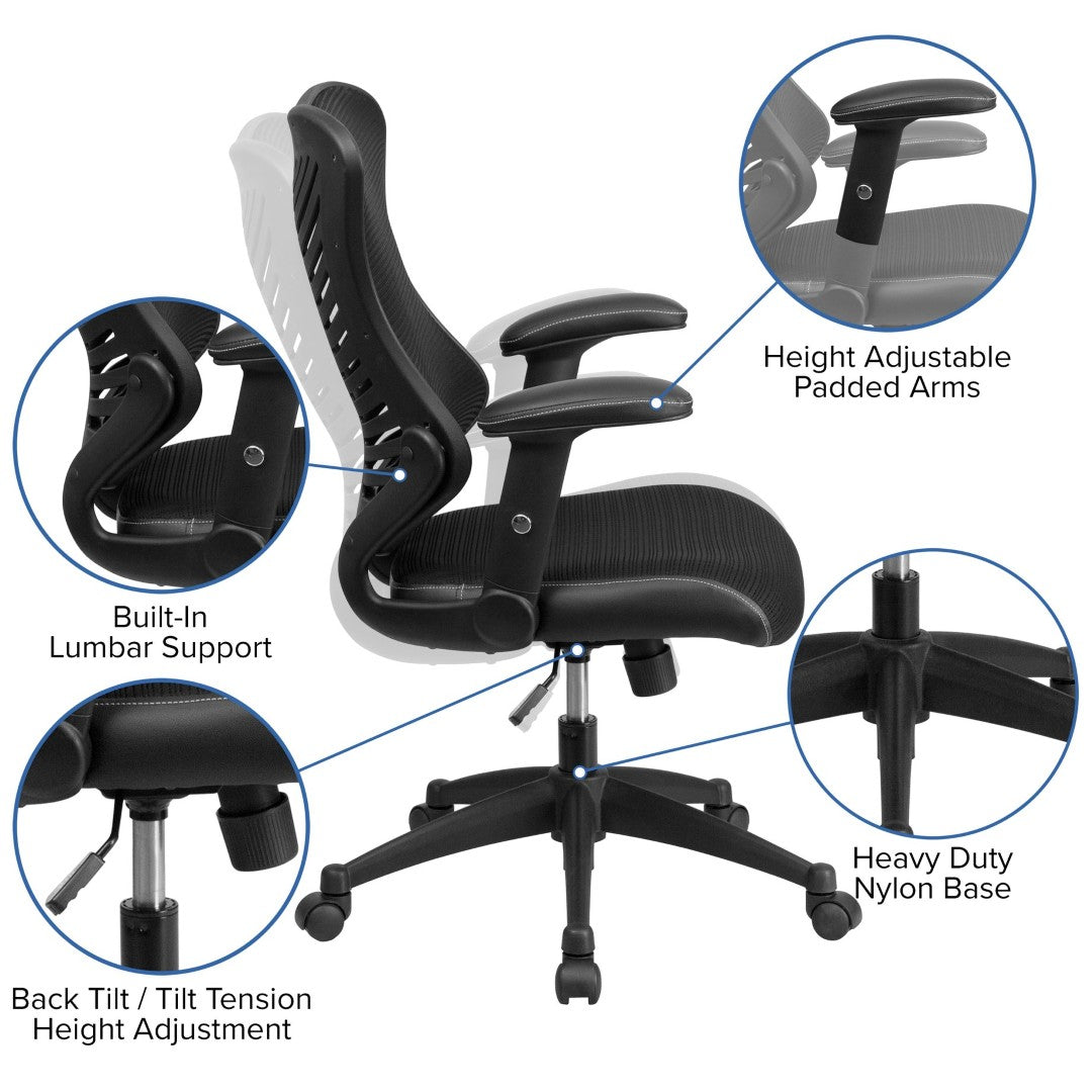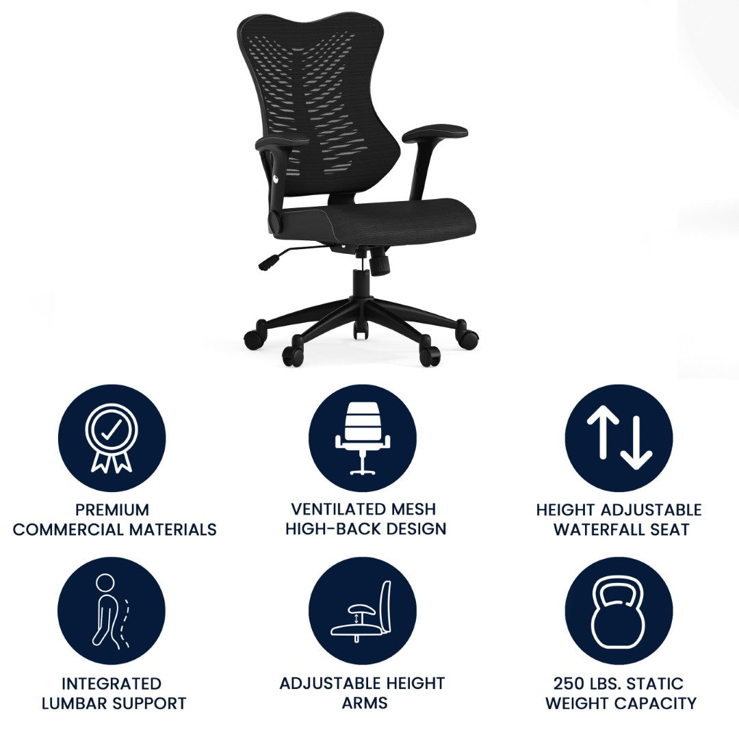 Experience comfort, support, and contemporary styling with this high-back mesh executive chair—designed to keep you cool and productive during long workdays. Its ventilated mesh back and built-in lumbar curve provide ergonomic support, while adjustable features let you tailor seating position for optimal comfort. Thoughtful details like padded, height-adjustable arms, a waterfall seat edge, and subtle white-contrast stitching deliver both function and a refined office look.