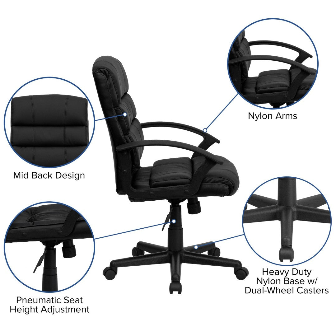 Bring comfort and professional style to any workspace with this versatile mid-back task chair. Upholstered in durable LeatherSoft for a premium look and soft feel, it’s designed for long periods of typing and general office use. Thoughtful ergonomic details—like a waterfall seat edge, adjustable tilt, and pneumatic height control—help reduce fatigue and improve posture, while 360° swivel and dual-wheel casters maximize mobility.