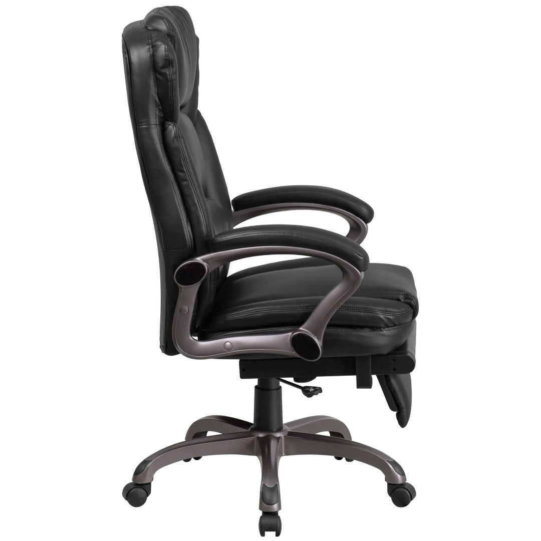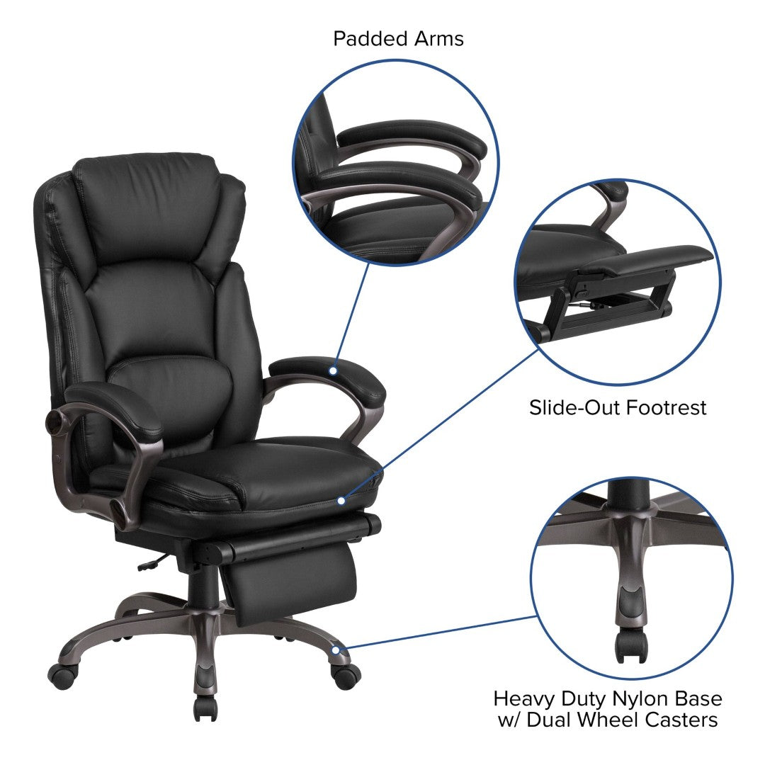 Give yourself the comfort and support needed to power through long workdays with this reclining executive office chair. Designed for both style and ergonomic performance, it combines a tall, padded profile with a built‑in headrest, outer lumbar cushion, and a slide‑out footrest so you can shift from focused work to relaxed recline in seconds. Durable LeatherSoft upholstery and adjustable tilt, height, and tension controls ensure personalized support throughout the day while a heavy‑duty base and smooth dual-wheel casters keep mobility and stability high.