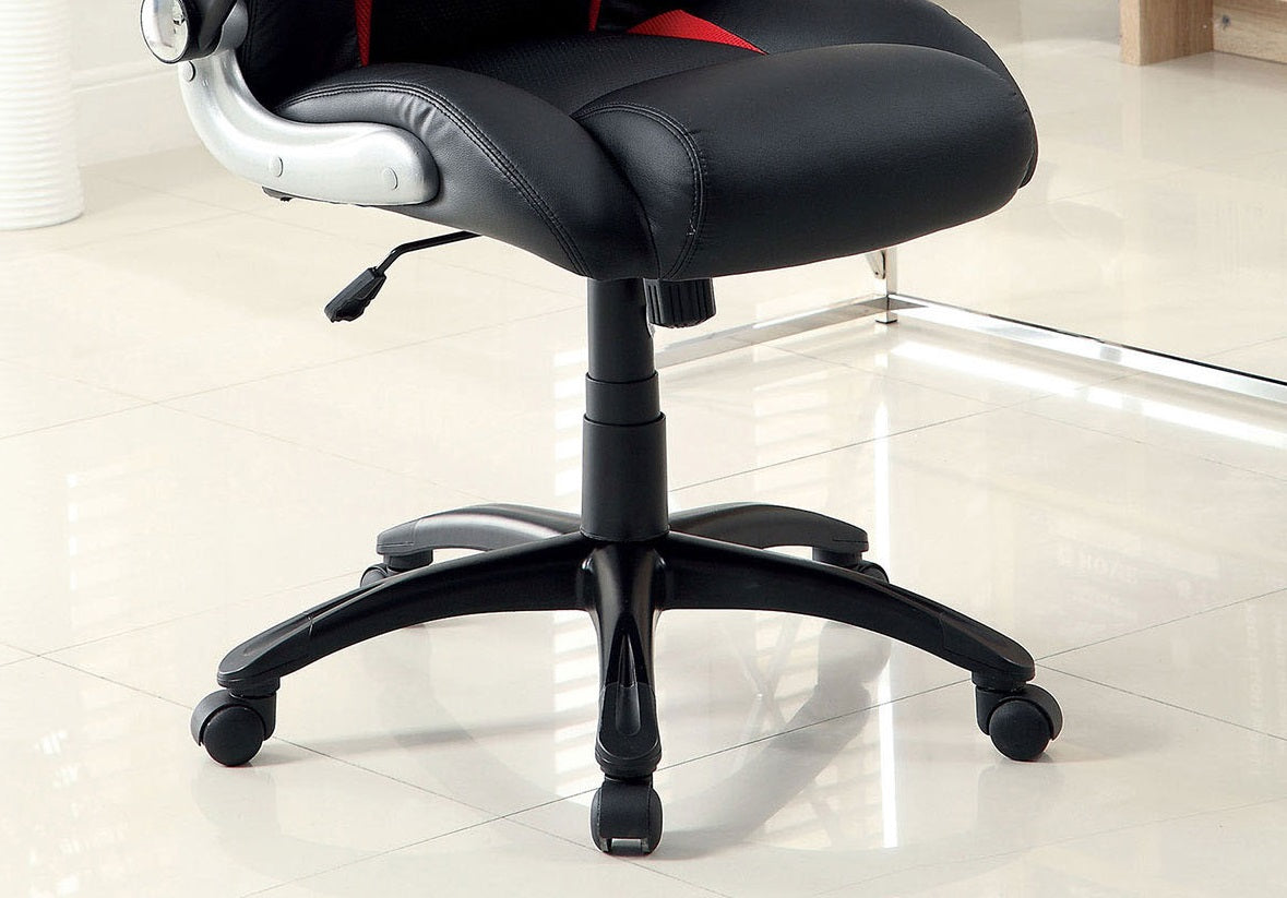 A bold, contemporary office chair that blends modern styling with ergonomic adjustability — ideal for gaming, home office, or executive workspaces. Upholstered in black leatherette with silver and red accents, this chair delivers an assertive aesthetic while providing customizable comfort through pneumatic height adjustment and a padded seat and back.
