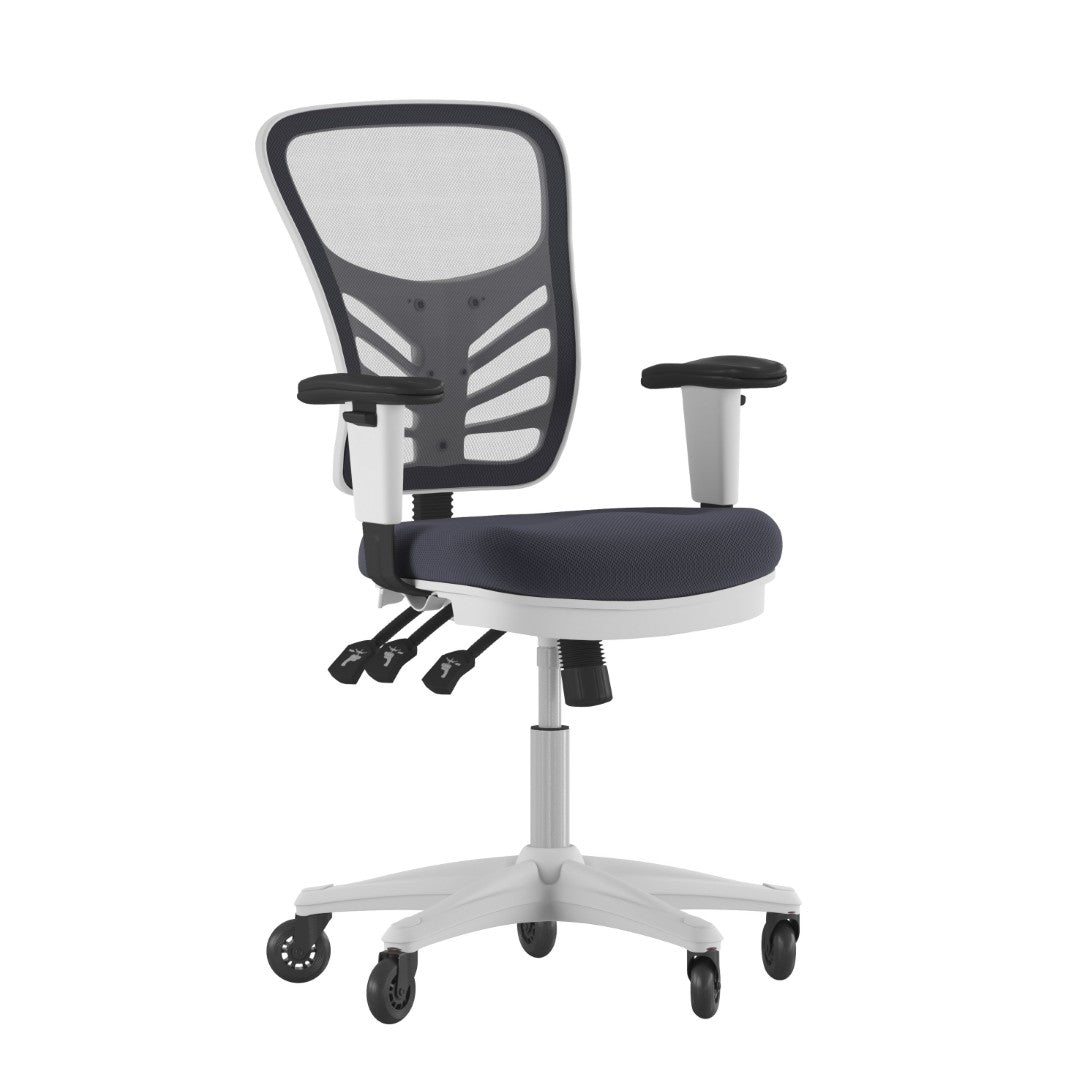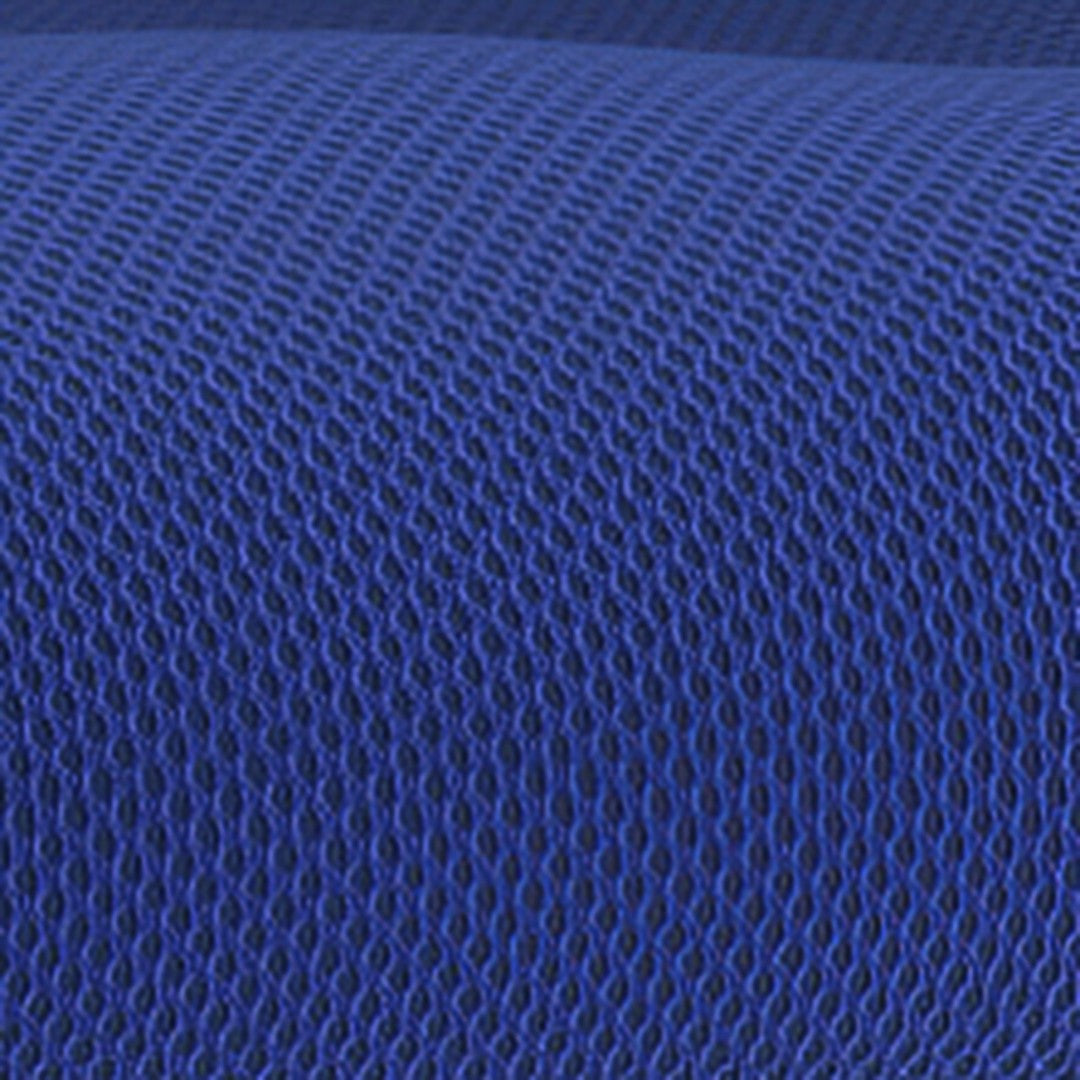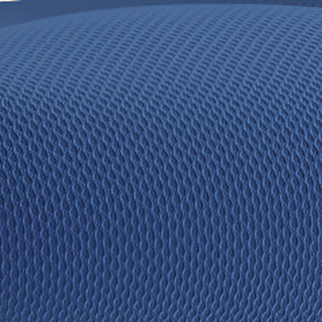- Ventilated blue mesh back with built-in lumbar contour for sustained lower-back support and improved airflow