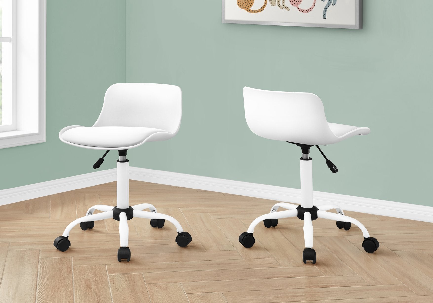 Create a comfortable, stylish workstation for your child with this contemporary white office chair. Designed with a clean leather-look upholstery and a sturdy white metal base, it combines ergonomic support, smooth mobility, and easy adjustability to suit growing kids and teens — ideal for homework, gaming, or craft time.