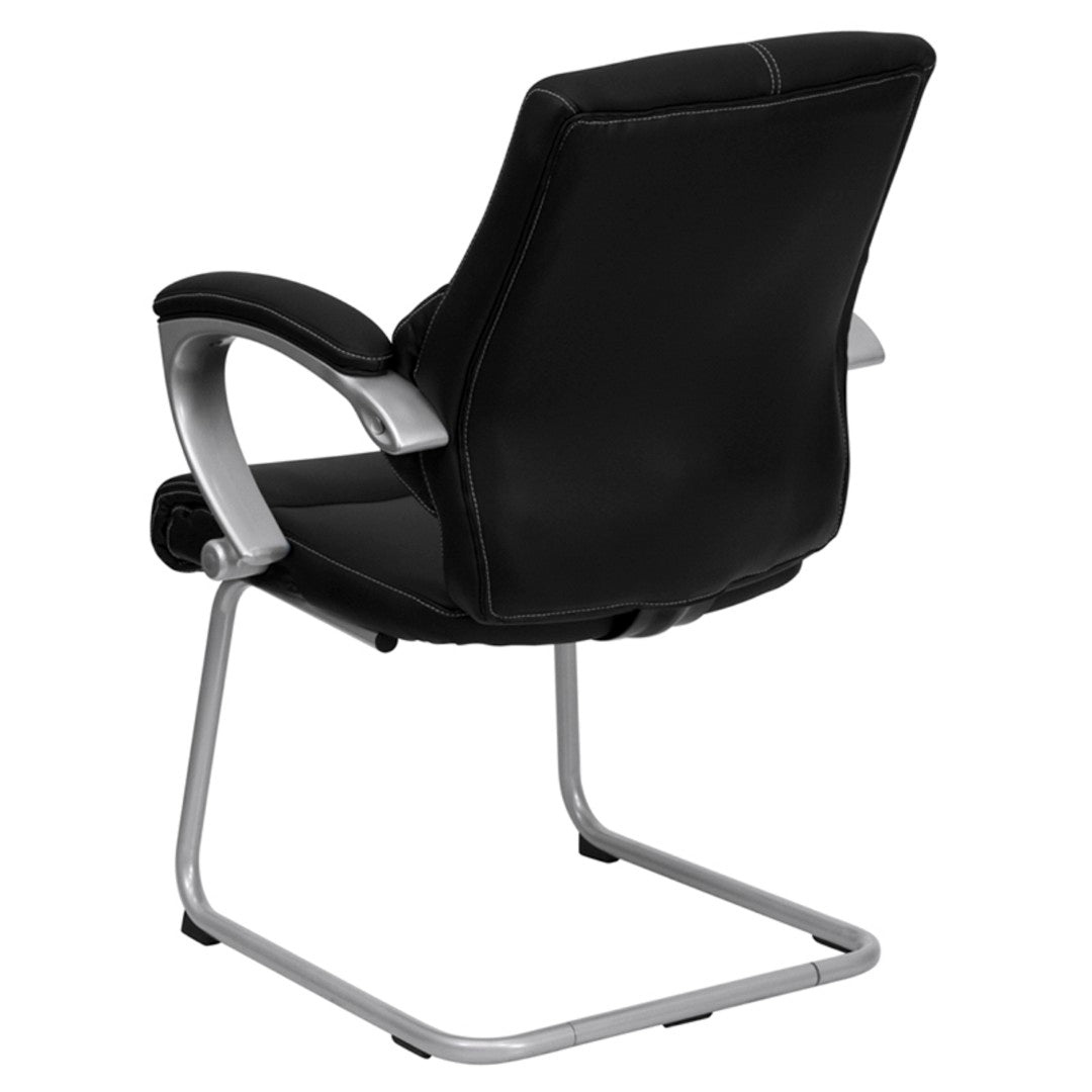 Create a welcoming and professional reception area with this sleek executive side chair that balances comfort, durability, and contemporary styling. Upholstered in soft LeatherSoft with contrasting white stitching, the chair offers supportive ergonomics—contoured cushions, built-in lumbar support and a waterfall seat—to keep guests comfortable during short or extended waits. Its silver powder-coated sled base and non-skid, anti-tilt floor levers make it especially suitable for carpeted areas, preventing snags and protecting flooring while providing a stable seating option.