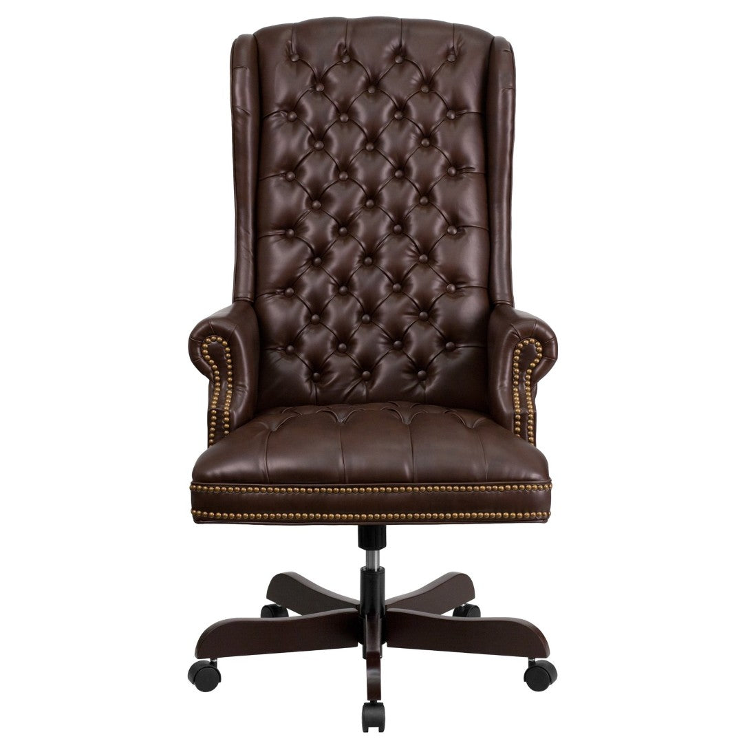 Elevate your workspace with a refined executive chair that blends classic craftsmanship and modern ergonomics. This high-back swivel office chair offers supportive comfort for long workdays while presenting a stately, traditional silhouette—complete with button tufting, rolled arms, and rich mahogany-accented details. Carefully engineered features like pneumatic height adjustment, tilt lock, and tilt tension control ensure customizable seating that enhances posture and reduces strain.