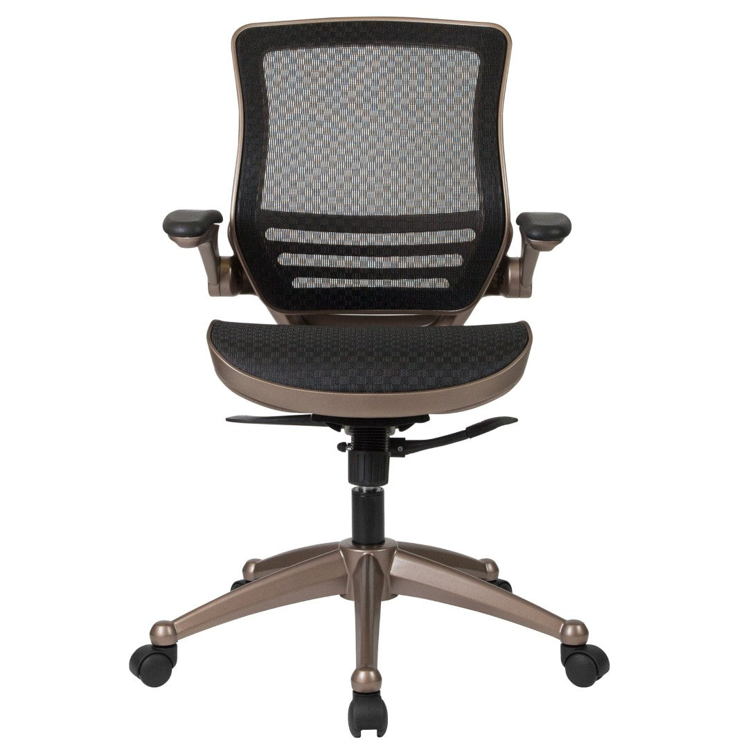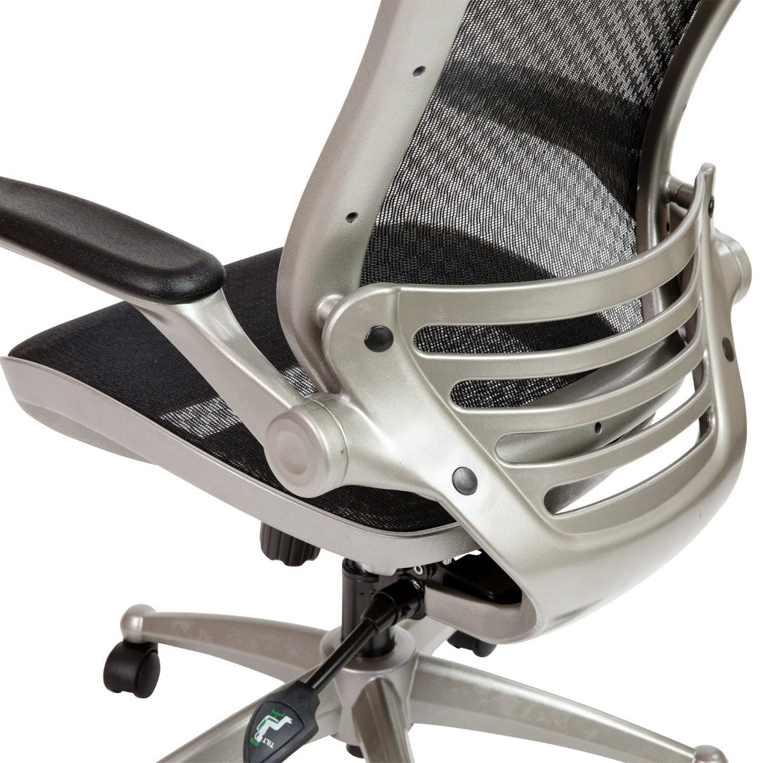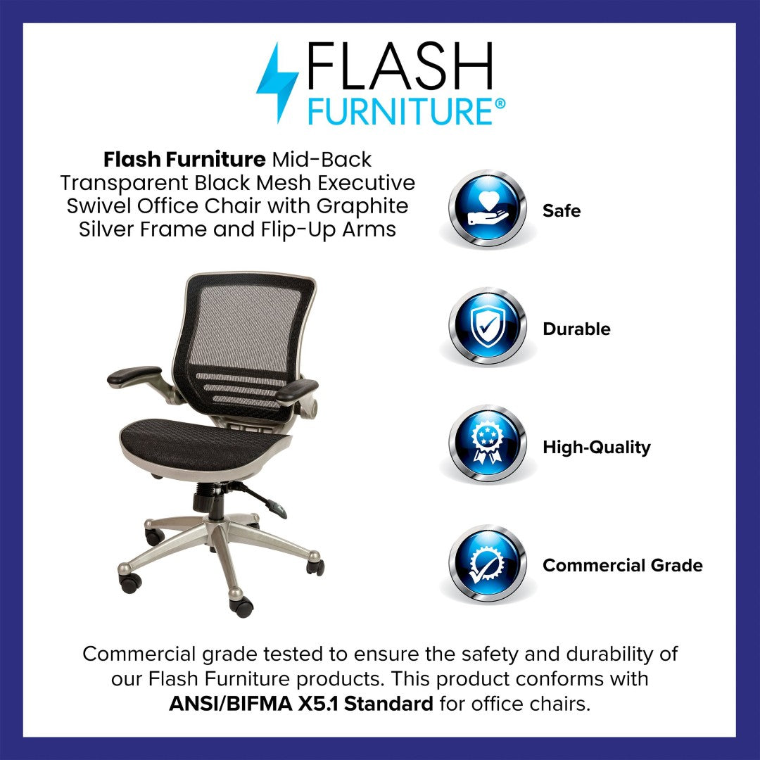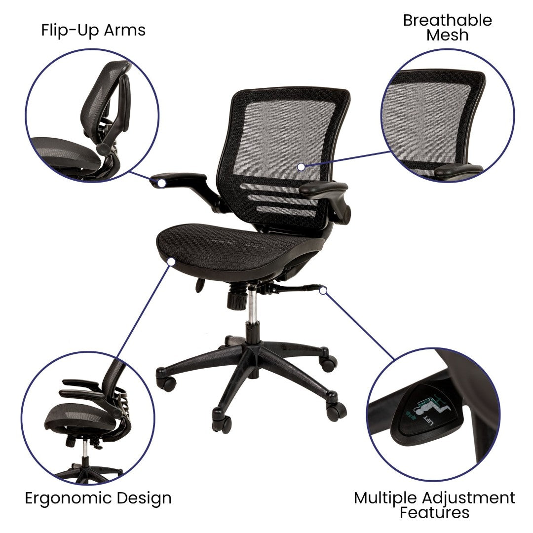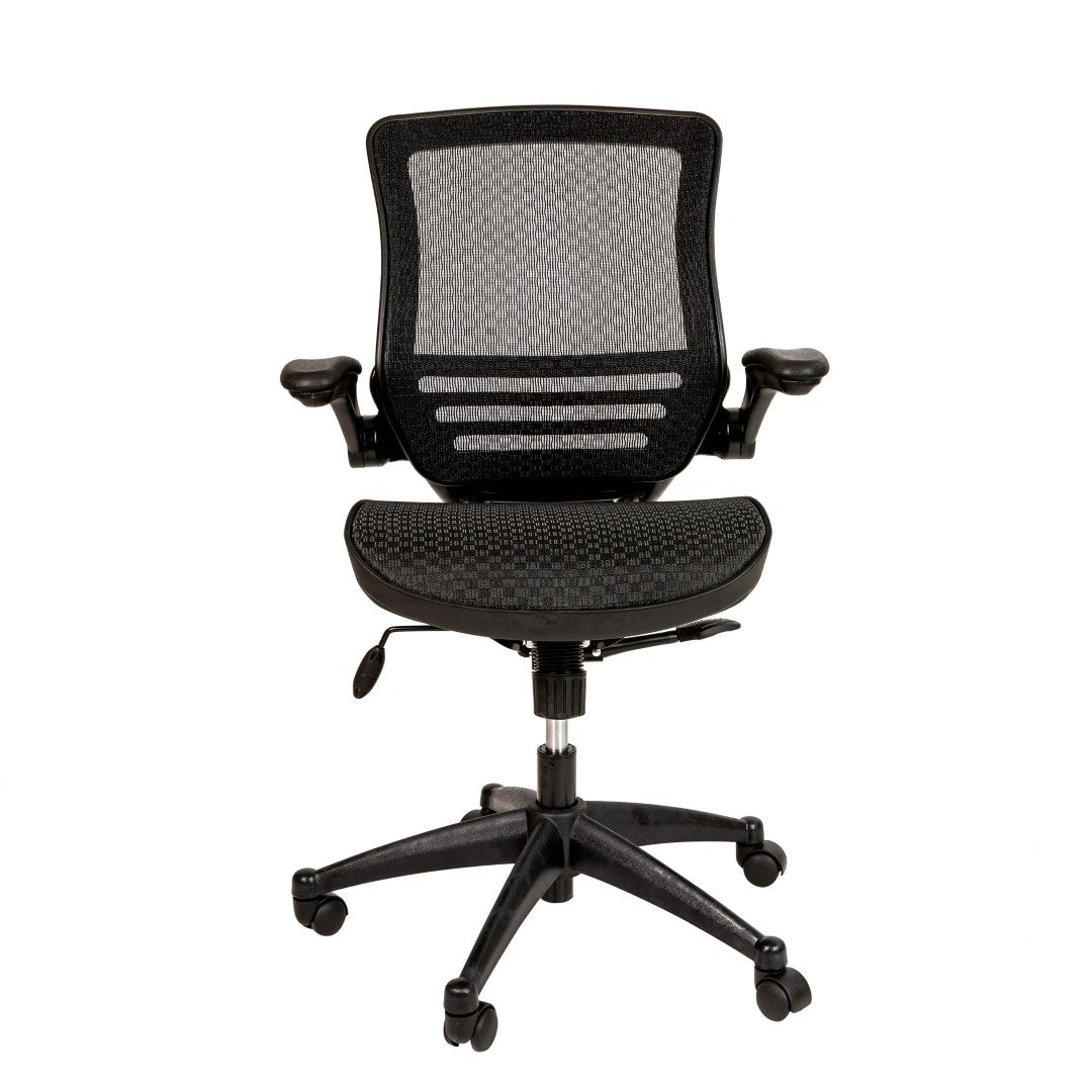Stay comfortable and productive throughout long workdays with this sleek mid-back executive mesh chair. Designed to combine breathable support with adjustable ergonomics, it helps reduce fatigue and promotes better posture whether you're at the office or working from home. Clean lines, a black frame, and flip-up padded arms make it versatile for tight workstations while premium features like synchro-tilt and a waterfall seat edge deliver lasting comfort.