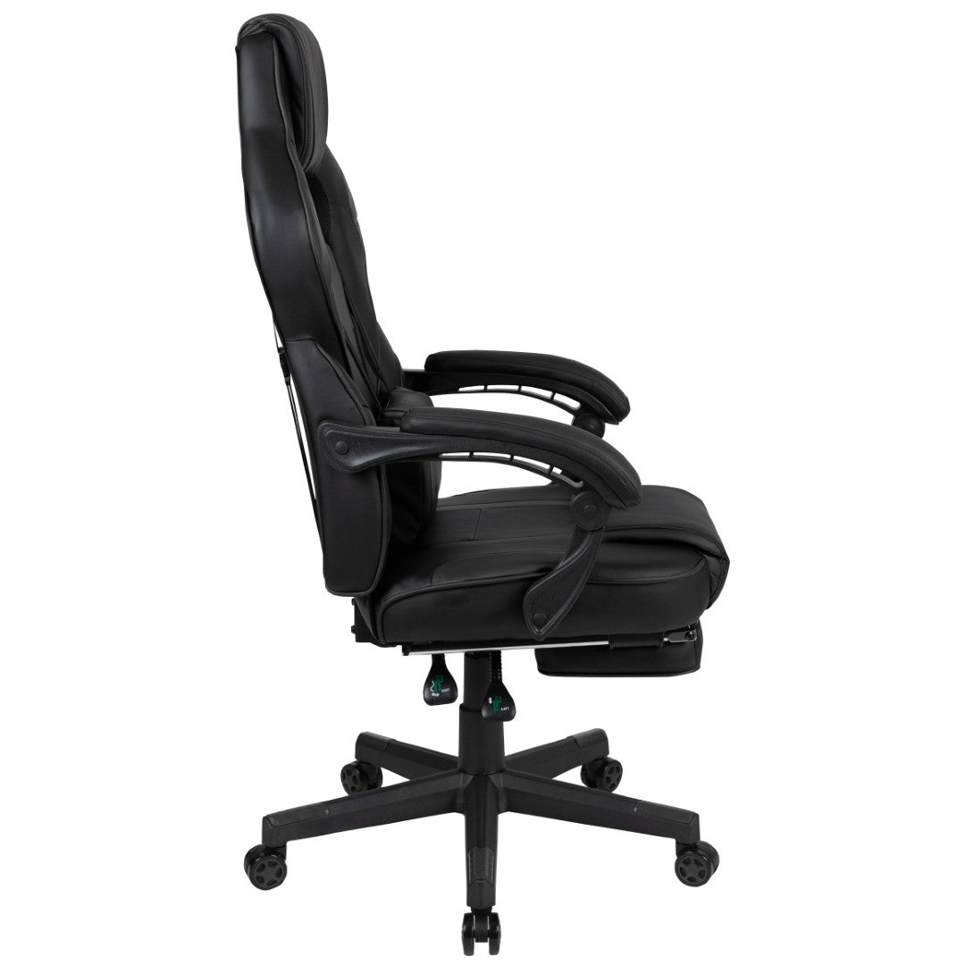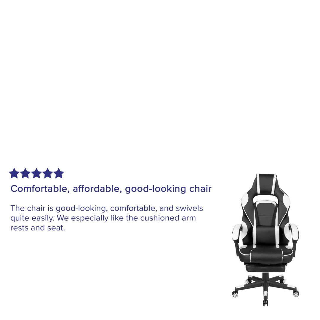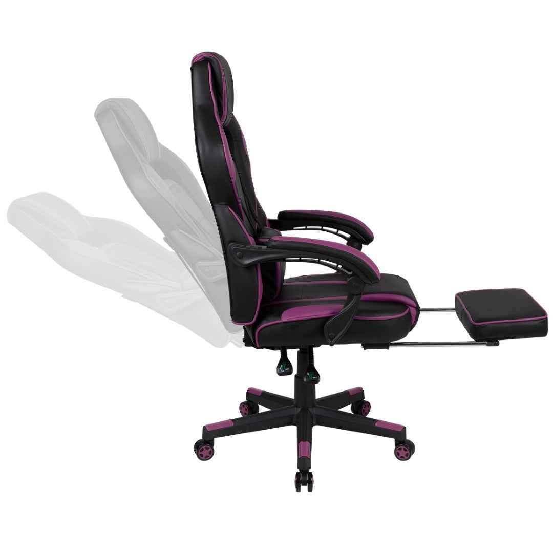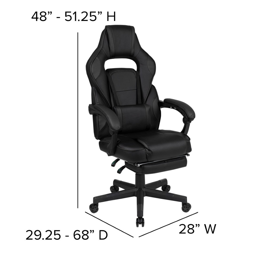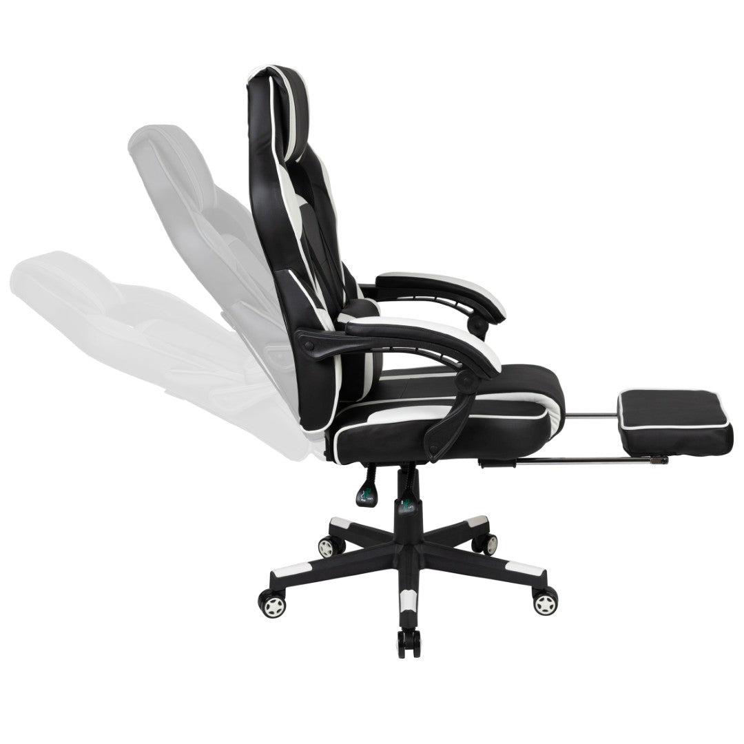 Sink into immersive comfort with this ergonomic gaming chair designed for long sessions—whether gaming, working, or studying. Thick padded cushions, a removable vibrating lumbar pillow, fully reclining back and arms, and a slide-out footrest combine to reduce pressure, support posture, and help you relax between rounds. Durable materials and smooth mobility make it practical for home offices, dorms, and gaming setups.