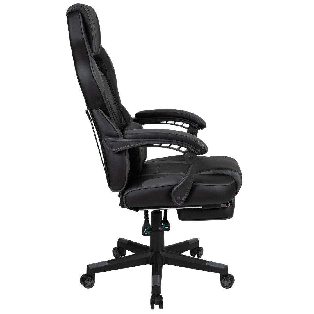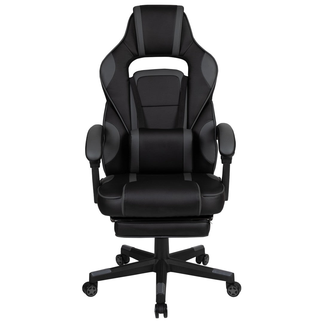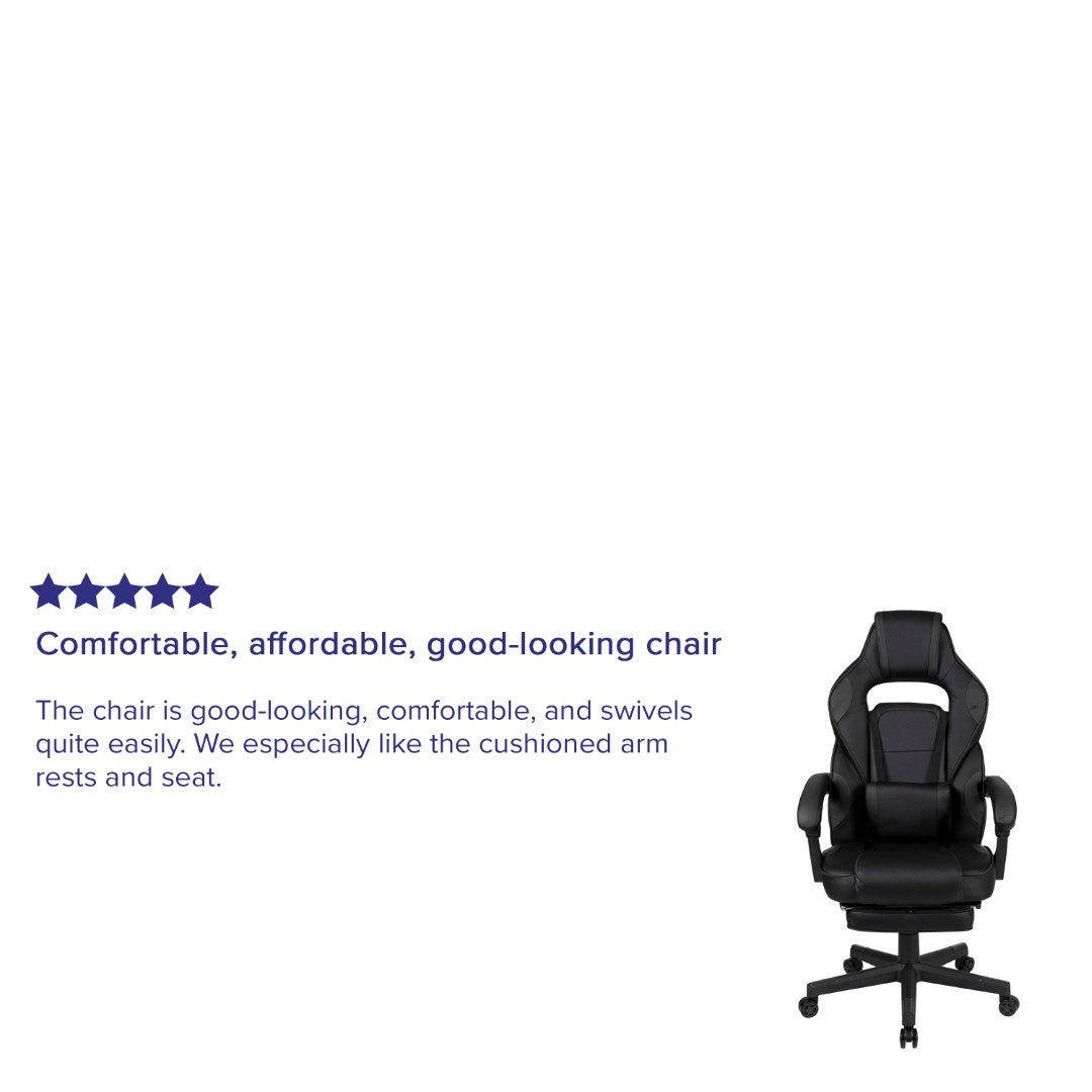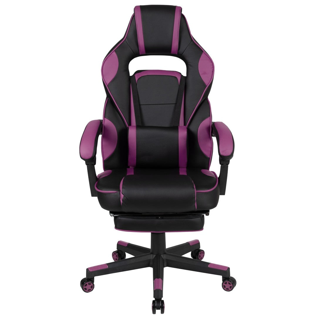 Sink into immersive comfort with this ergonomic gaming chair designed for long sessions—whether gaming, working, or studying. Thick padded cushions, a removable vibrating lumbar pillow, fully reclining back and arms, and a slide-out footrest combine to reduce pressure, support posture, and help you relax between rounds. Durable materials and smooth mobility make it practical for home offices, dorms, and gaming setups.