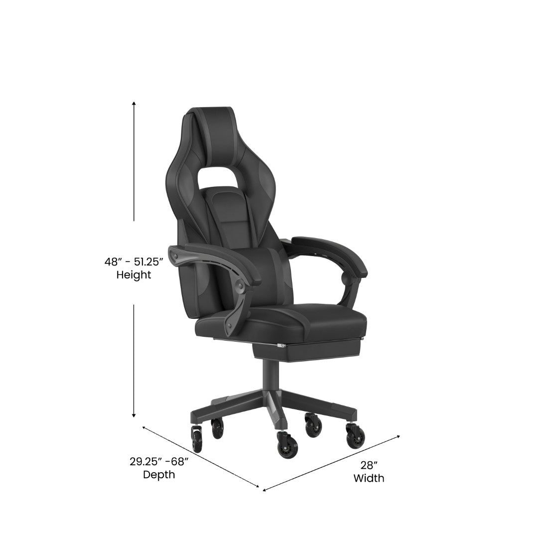 Sink into long-session comfort with the X40 Racing-style gaming chair — a fully reclining, ergonomically designed seat built for gamers and professionals who need support through extended play or work. Thick padding, a removable massaging lumbar pillow with USB power, and synchronized arm/back reclining combine with a slide-out footrest and smooth transparent roller wheels to deliver relaxation, posture support, and mobility in a single stylish black package.