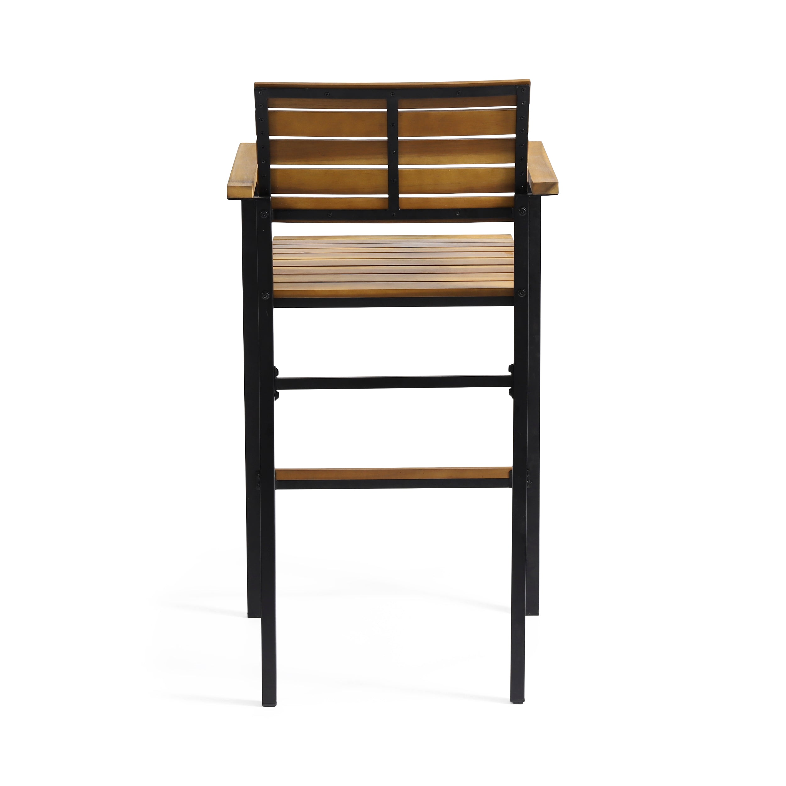 Elevate your outdoor entertaining with these industrial-accented acacia wood barstools — a set of two that pairs durable materials with refined craftsmanship. The warm teak finish and black iron legs create a striking contrast, while the slatted seat and back offer breathable comfort and visual interest. Hand-crafted details and sturdy construction make these stools ideal for patios, poolside bars, or casual indoor kitchen islands.
