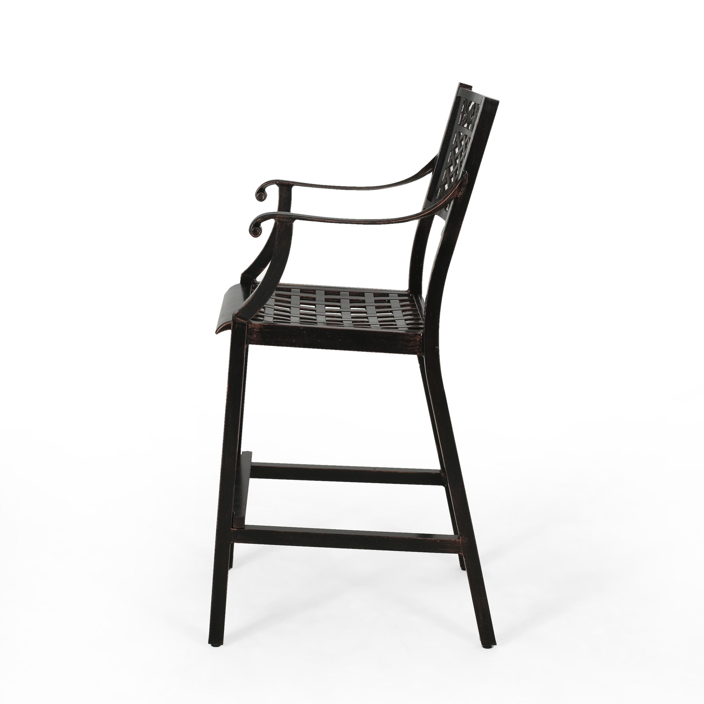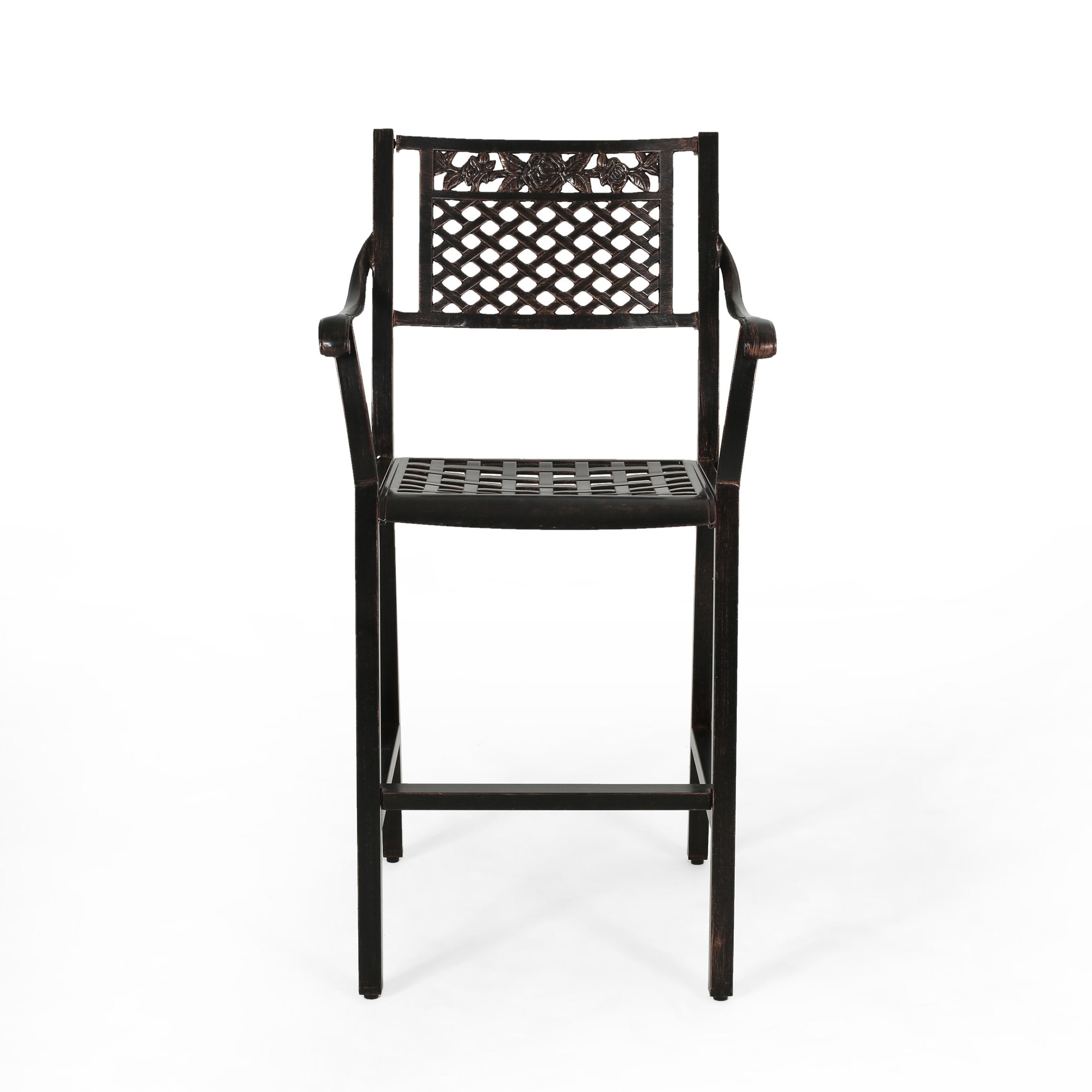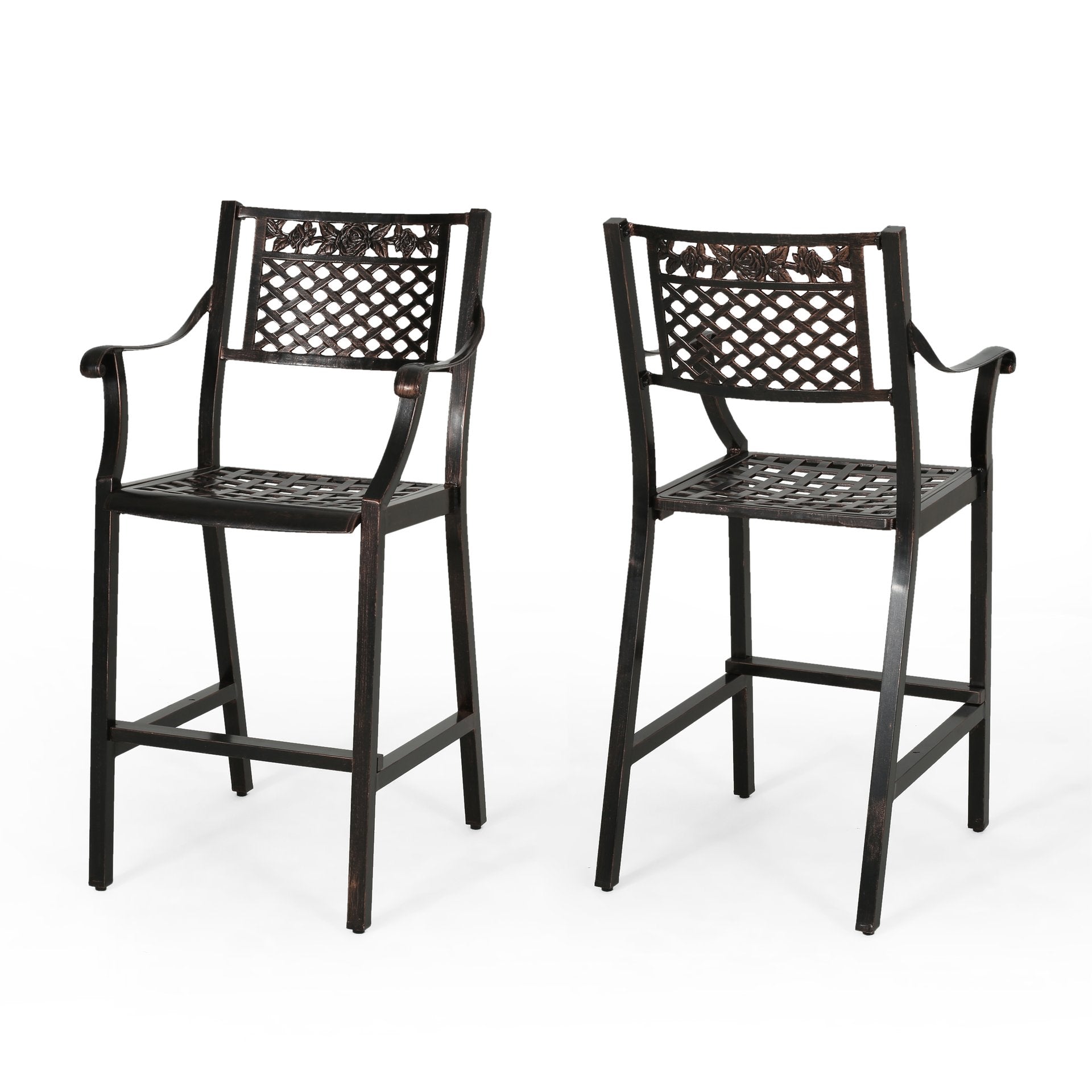 Enjoy relaxed outdoor entertaining with this elegant two-piece barstool set that blends traditional scrollwork and a breathable mesh seat for classic curb appeal and all-weather performance. Crafted from cast aluminum with a warm copper finish, the stools are lightweight yet durable, resistant to rust, and designed to complement patios, decks, and poolside bars. Hand-crafted details and a comfortable seat height make them as functional as they are attractive.
