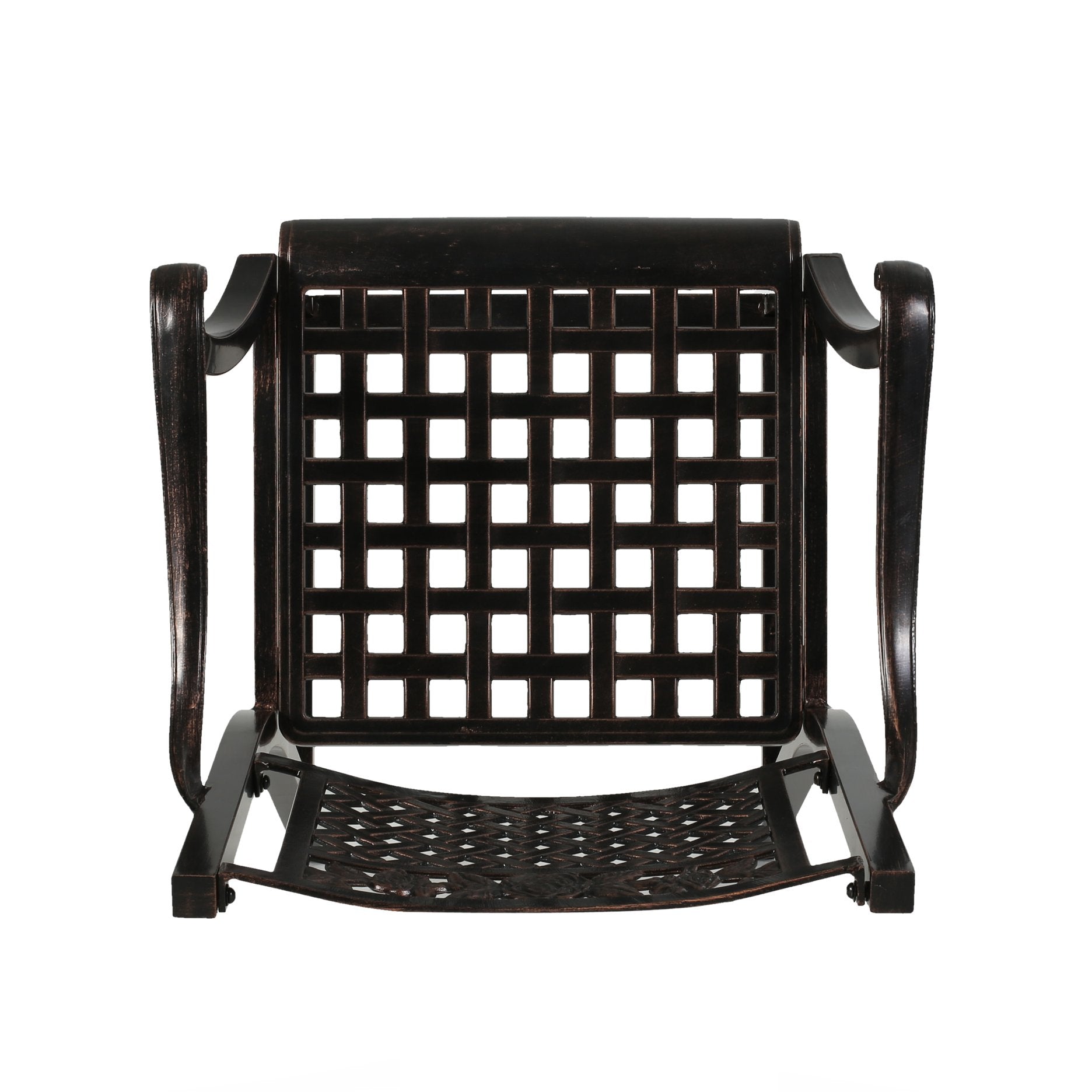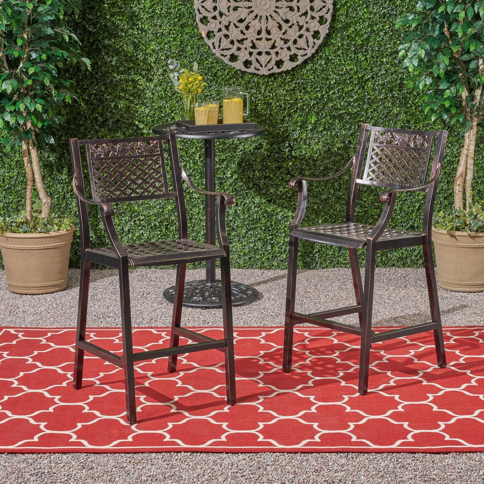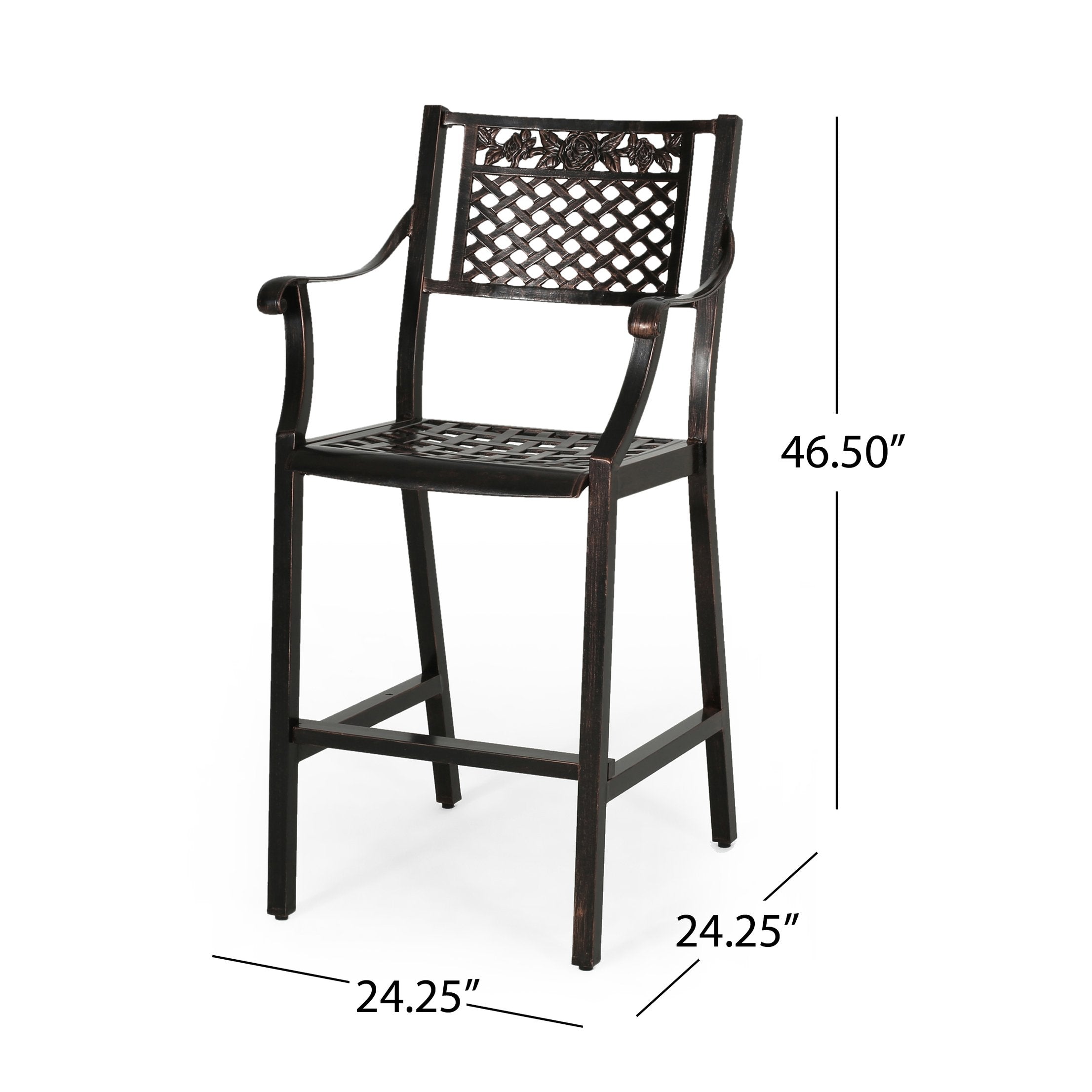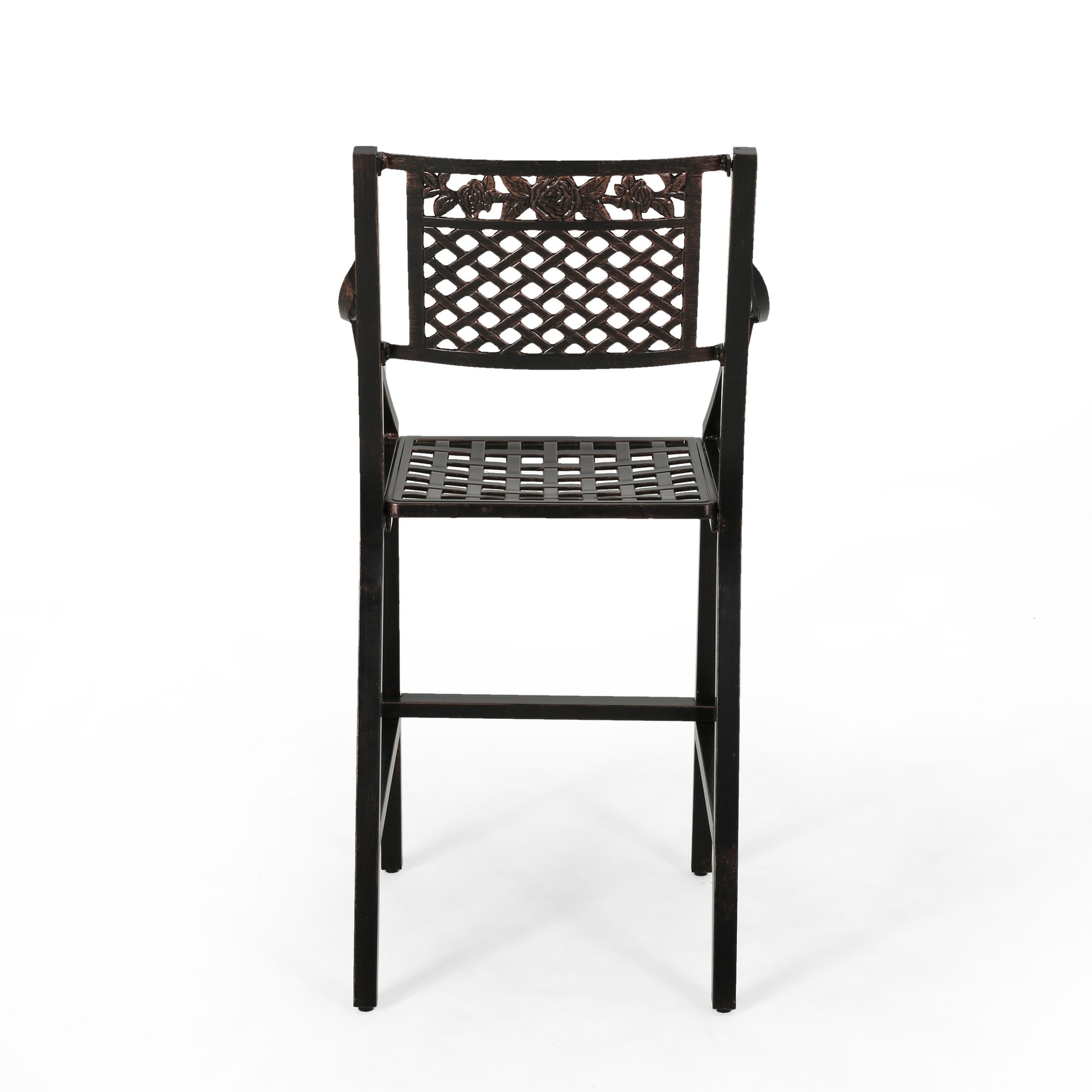 Enjoy relaxed outdoor entertaining with this elegant two-piece barstool set that blends traditional scrollwork and a breathable mesh seat for classic curb appeal and all-weather performance. Crafted from cast aluminum with a warm copper finish, the stools are lightweight yet durable, resistant to rust, and designed to complement patios, decks, and poolside bars. Hand-crafted details and a comfortable seat height make them as functional as they are attractive.