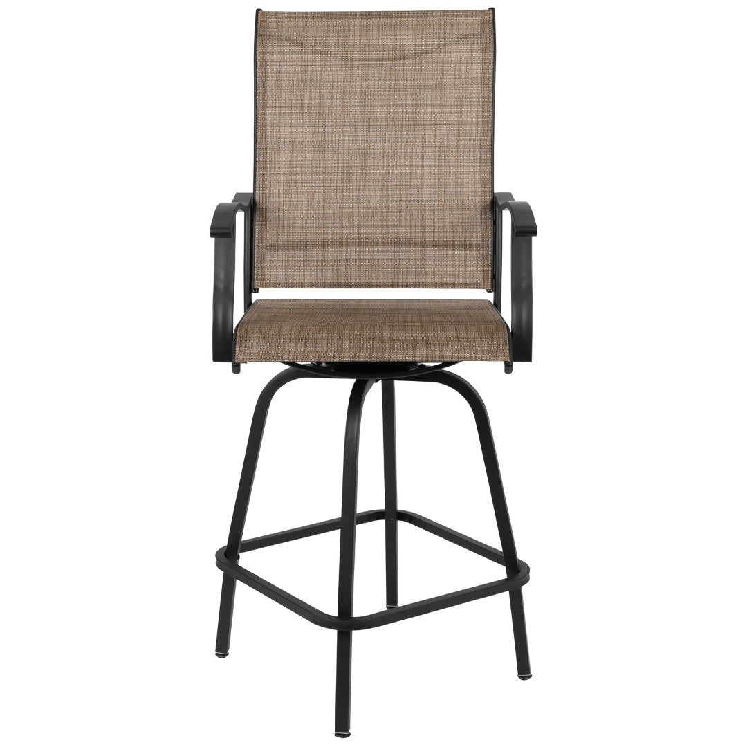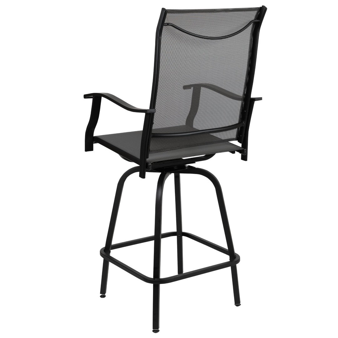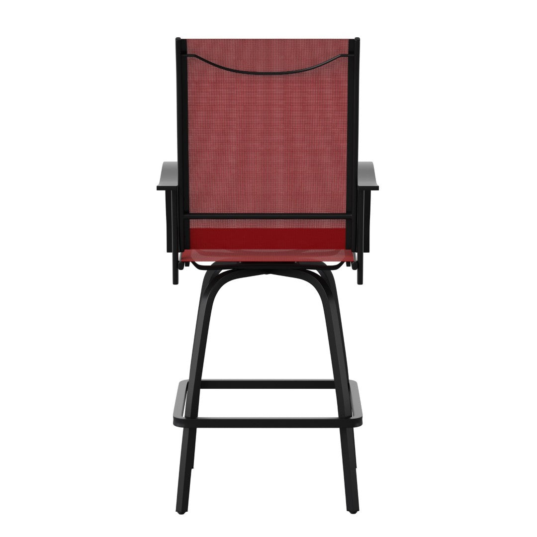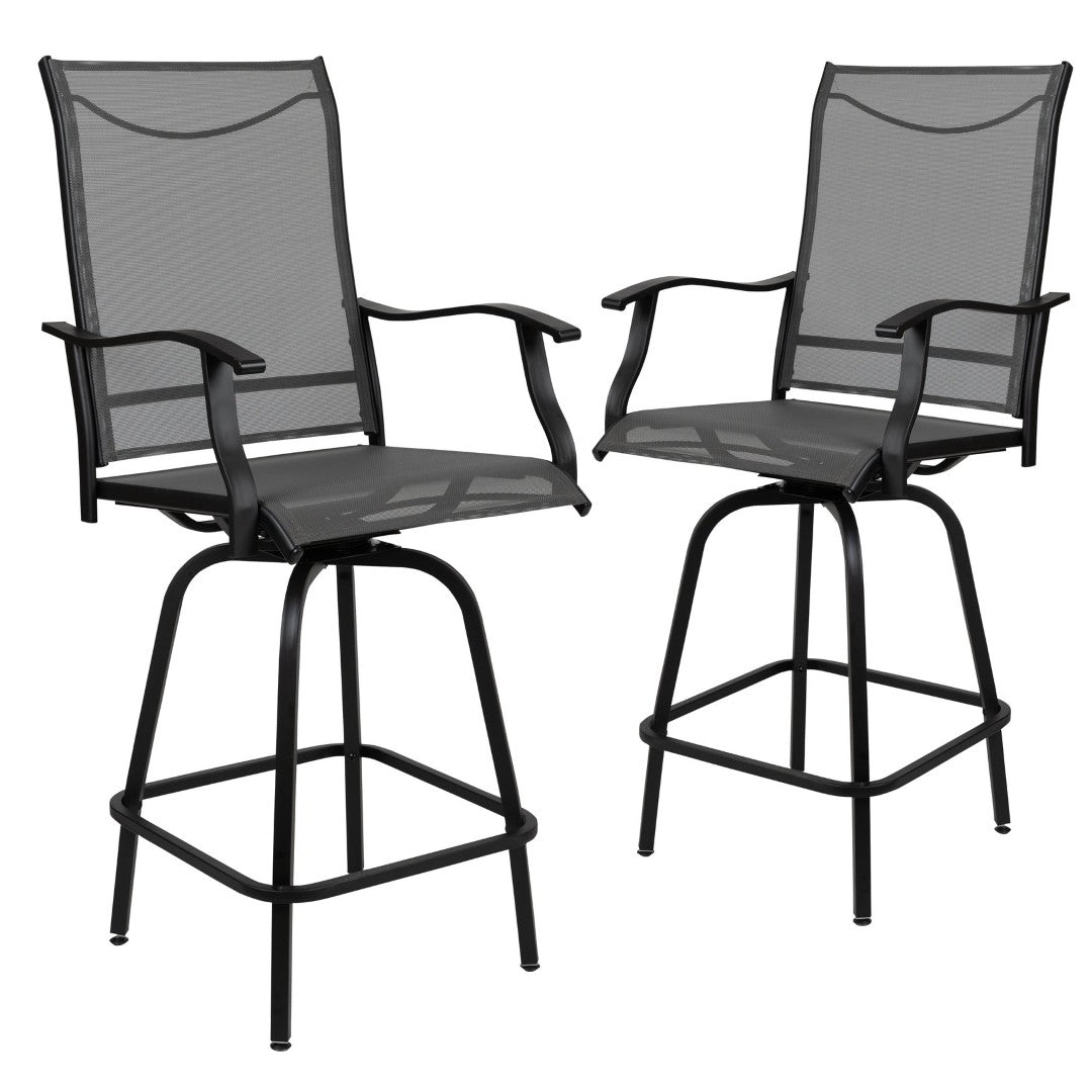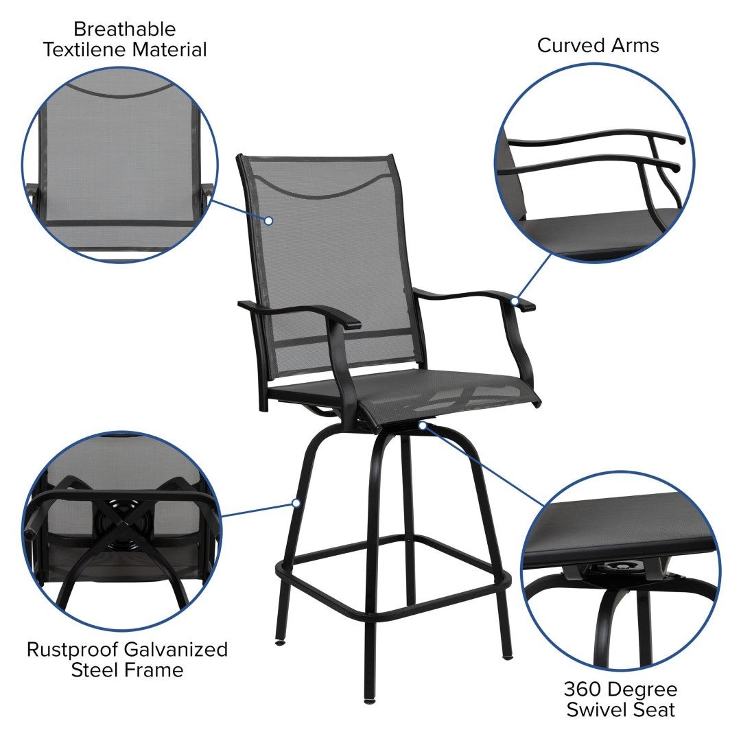 Enjoy outdoor dining and socializing in comfort and style with this set of two high‑back swivel patio bar stools. Built for all‑weather use, they combine breathable Textilene seating with a rustproof galvanized steel frame, curved arms and a waterfall seat design to reduce pressure and keep you comfortable during long conversations or casual meals. The 360° swivel and integrated footrest make them easy to approach and relaxed to sit in, while the ventilated sling fabric helps keep you cool on warm days.
