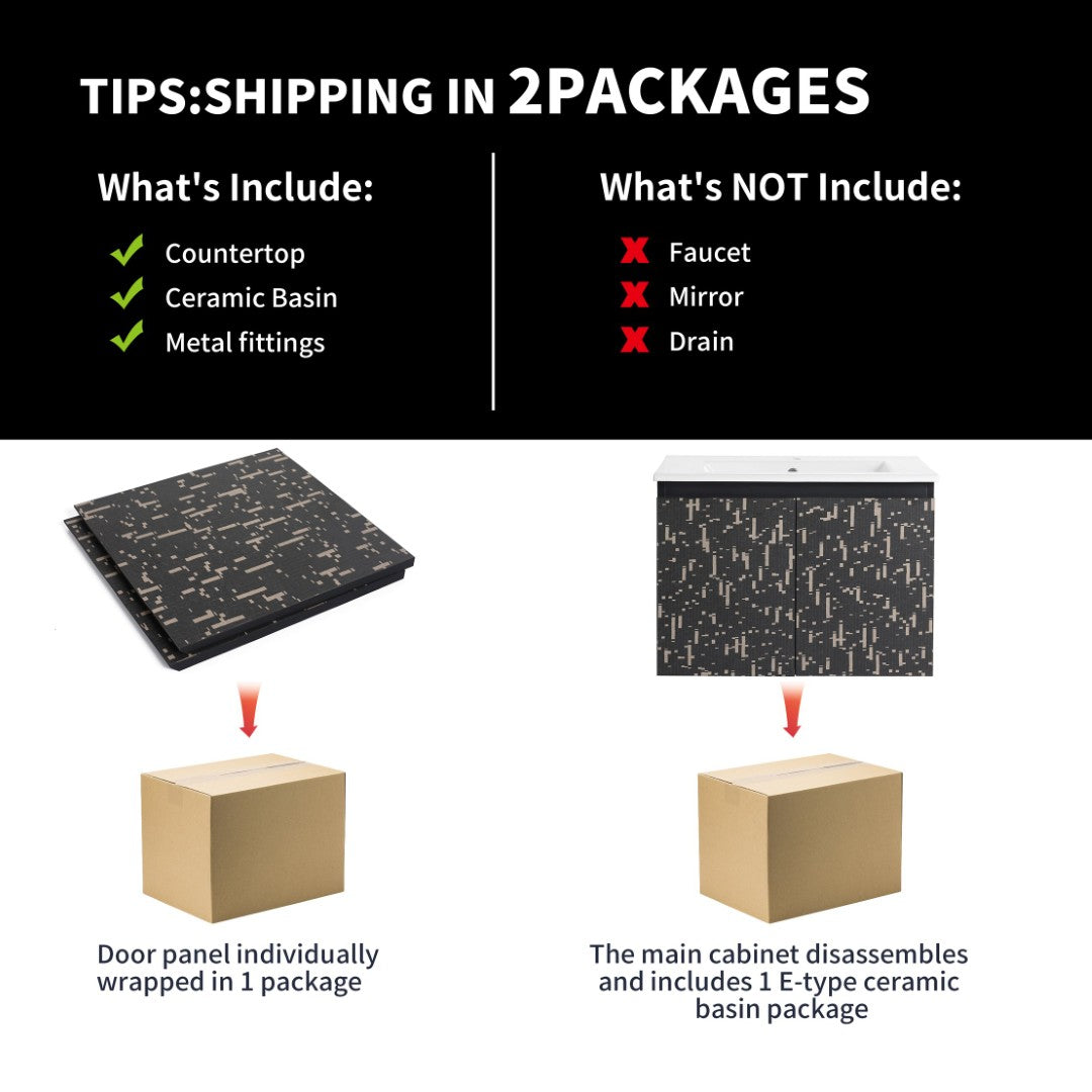 - Package Contents: 1x vanity cabinet, 1x ceramic sink, 2x door planks, and parts package (faucet, drain assembly, P-trap, backsplash, and mounting bracket not included).