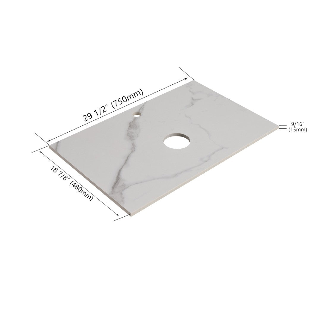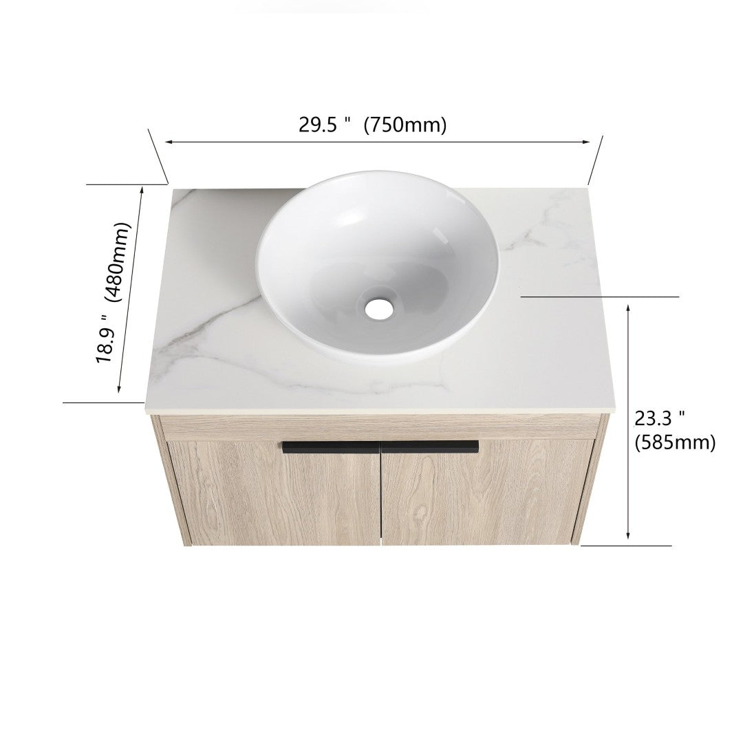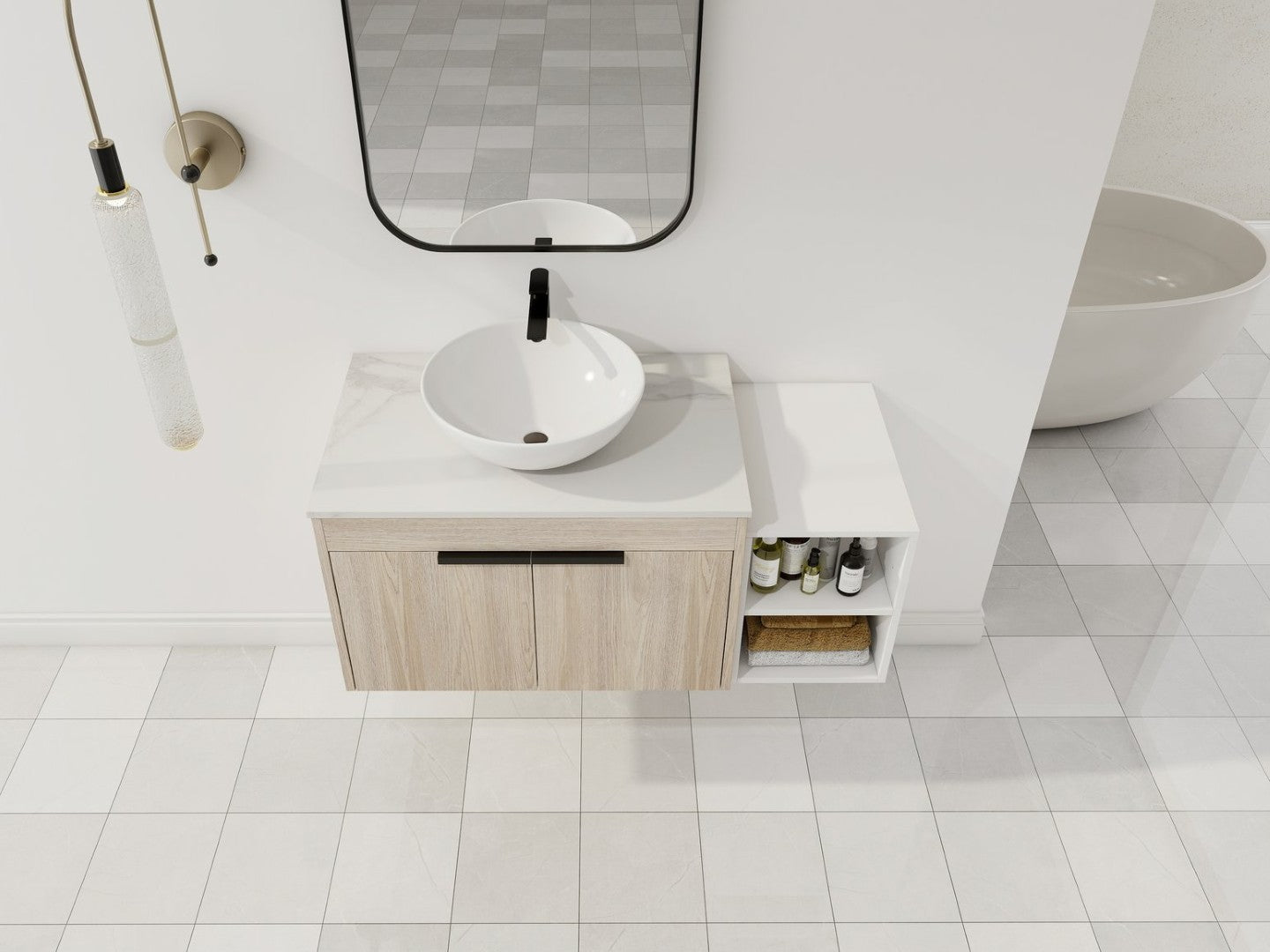 - Package Contents: Includes vanity cabinet, ceramic art basin, white flat stone slab, two metal handles, wall-mounted storage shelf, and parts package. (Faucet, pop-up drain, drain assembly, P-trap, backsplash, and mounting bracket not included.)