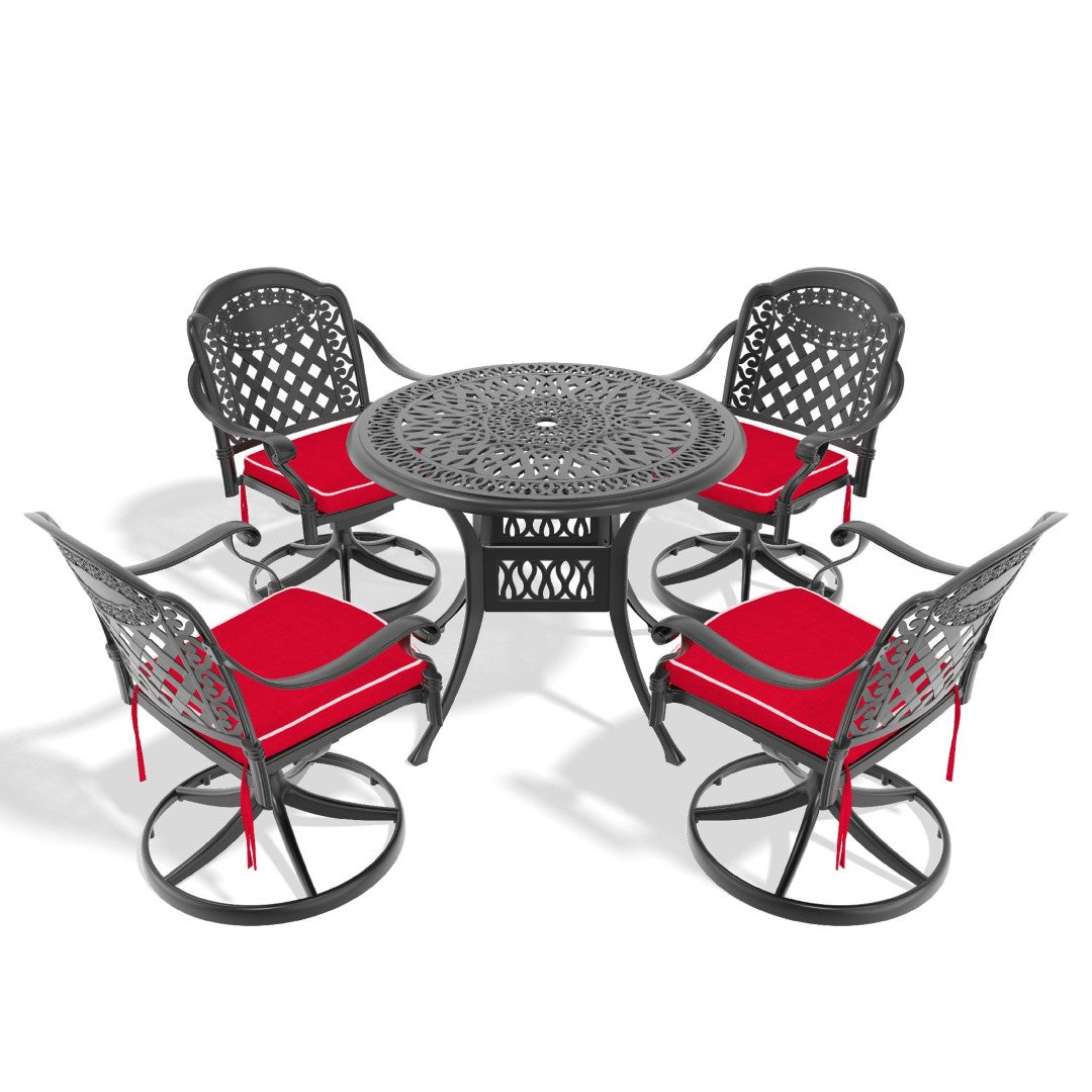 Enjoy effortless outdoor dining with this durable 5-piece cast aluminum set designed for all-weather living. The set pairs a compact 30.71" round table with four comfortable swivel chairs that include weather-resistant cushions, giving you a stylish, low-maintenance solution for patios, balconies, or small yards.