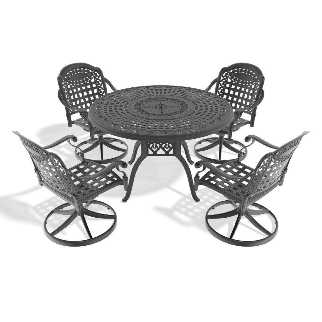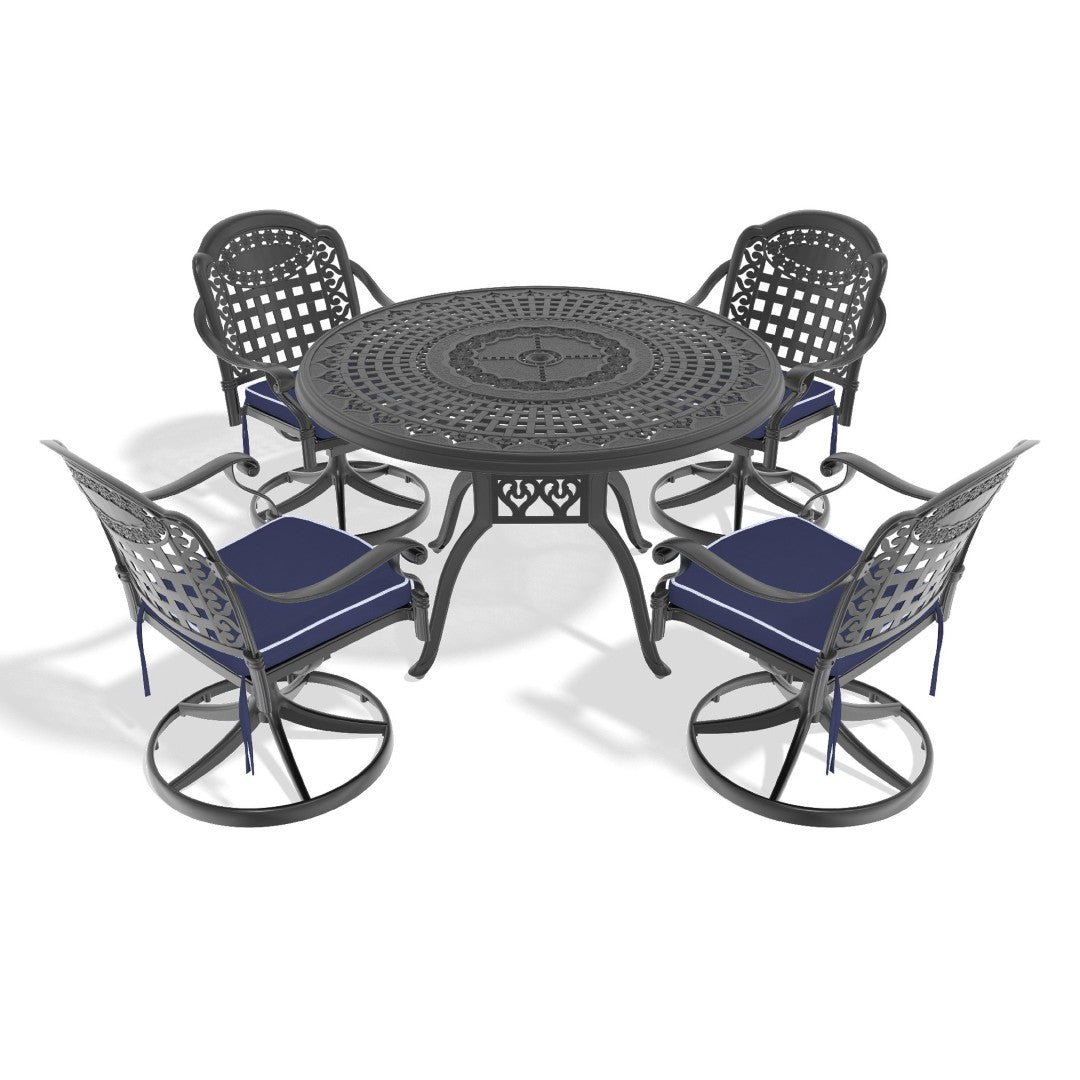 Enjoy outdoor dining in style with this durable 5-piece cast aluminum set designed for all-weather use. The set includes four comfortable swivel chairs with cushions and a spacious round table—perfect for patios, decks, or poolside entertaining. Built with a powder-coated black aluminum frame for rust resistance and low maintenance, it blends classic looks with practical performance.