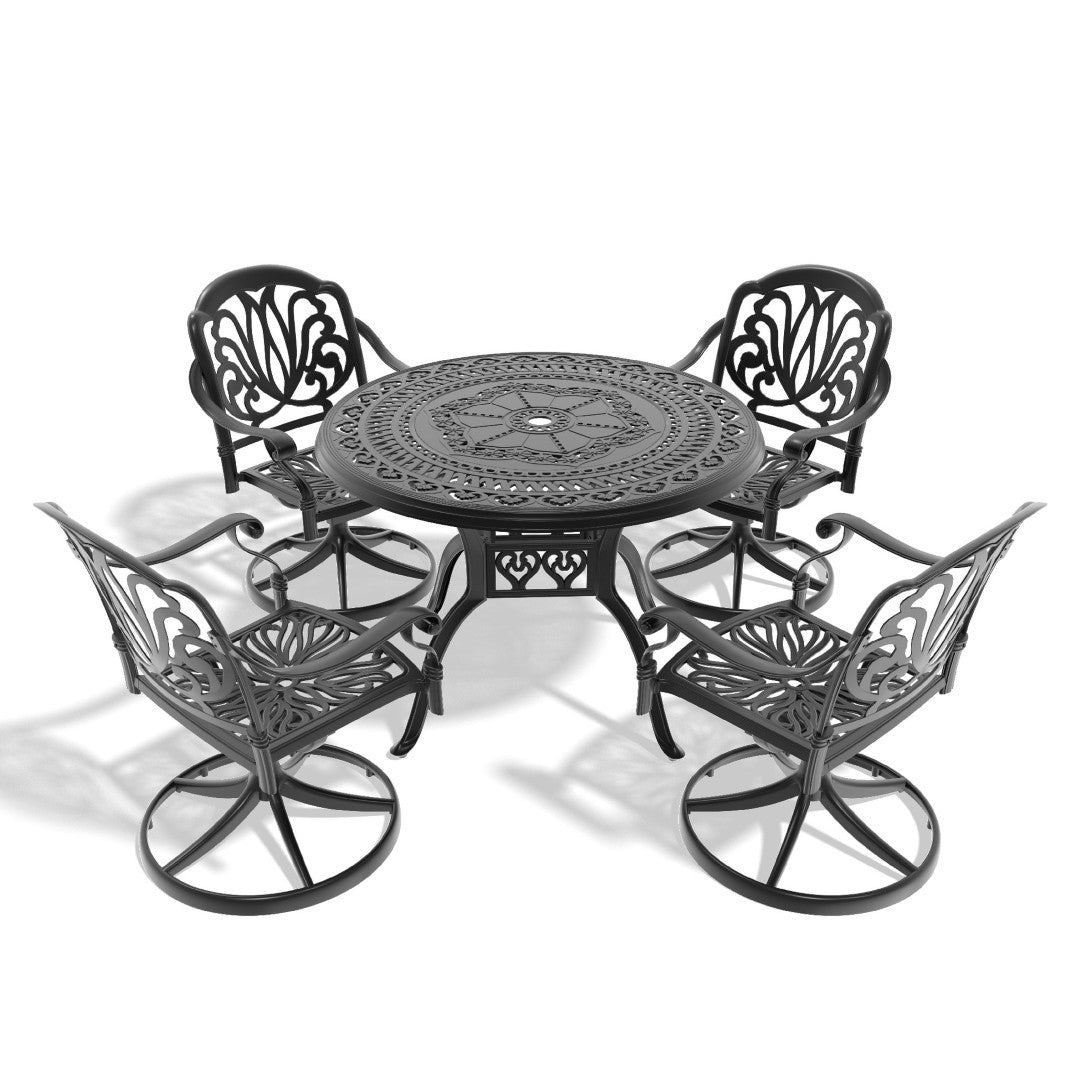 Enjoy relaxed outdoor dining with this durable 5-piece all-weather cast aluminum dining set. Expertly crafted for year-round use, the set pairs a spacious rectangular table with four comfortable swivel chairs, each topped with plush cushions for added comfort. Its powder-coated black finish resists rust and fading, while the swivel function and ample weight capacities make it practical for everyday use and entertaining.