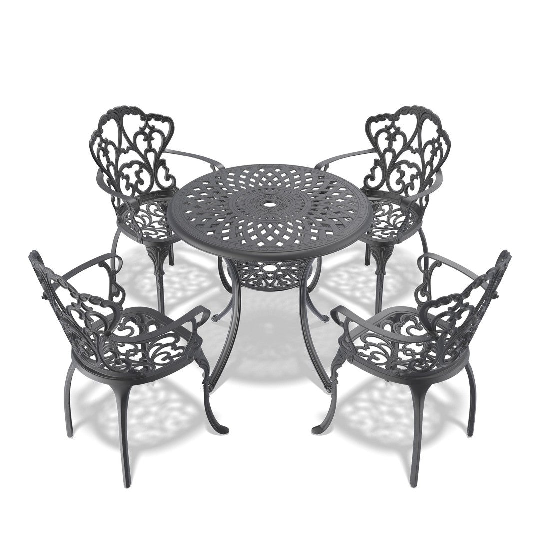 Enjoy outdoor dining and relaxation with this elegant 5-piece cast aluminum patio set, featuring durable construction, comfortable off-white cushions, and a compact round table perfect for small patios, balconies, or poolside. Designed for easy assembly and everyday use, the set blends classic styling with weather-ready materials for seasons of enjoyment.