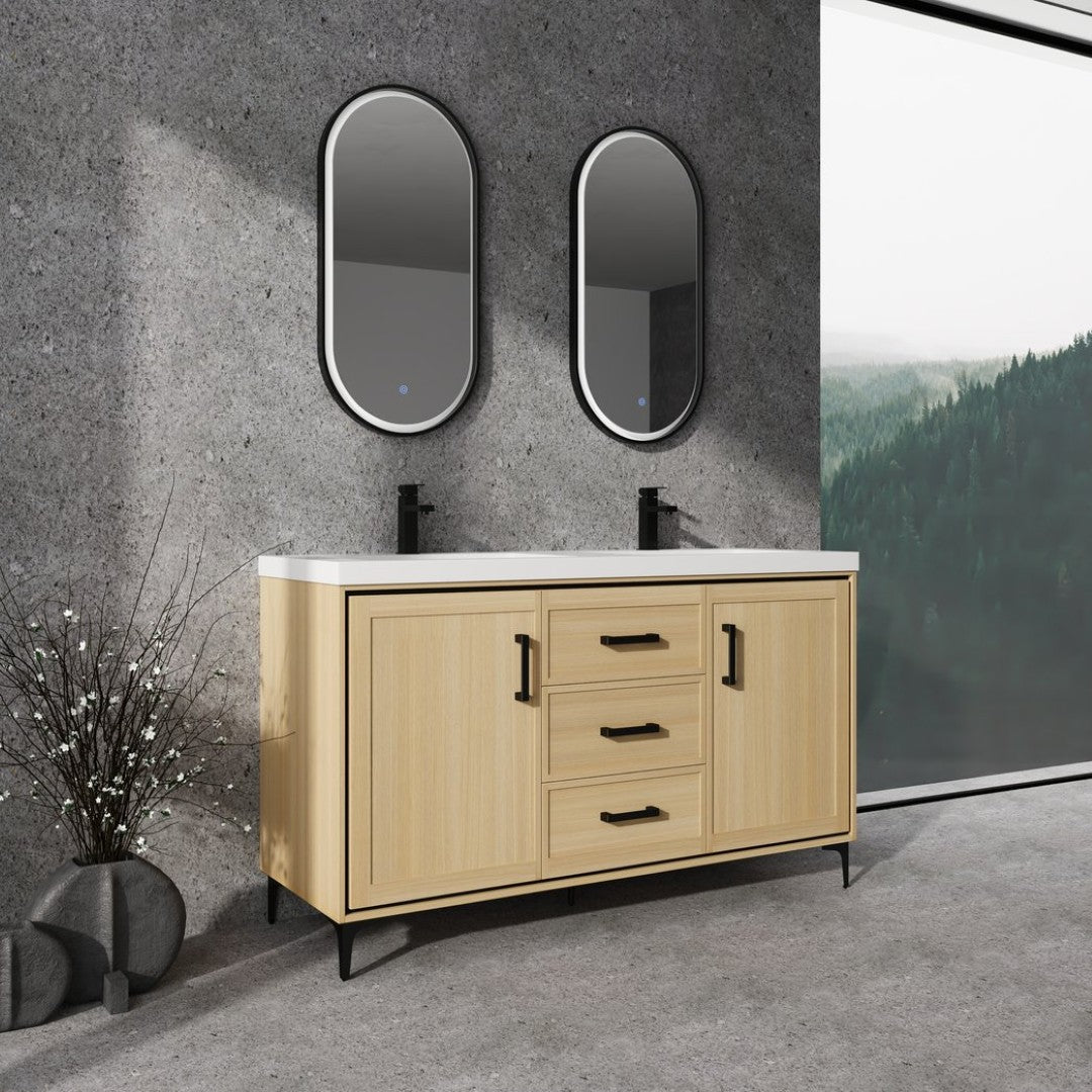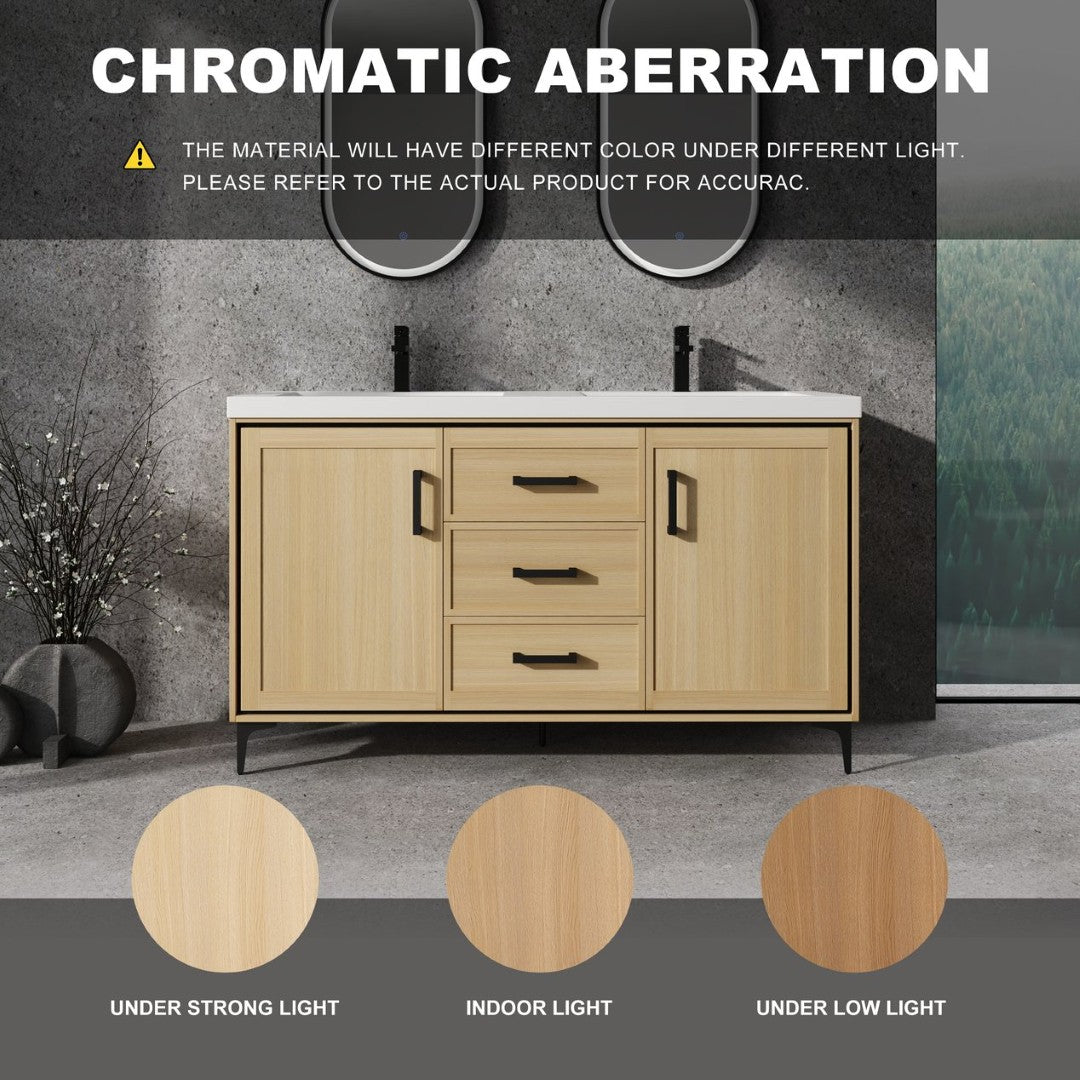 Transform your bathroom into a refined, functional space with this freestanding 60" vanity that pairs modern convenience with a warm original oak finish. Pre-assembled for an easier installation, the unit features a durable double resin sink and soft-closing doors and drawers for quiet, smooth operation—ideal for busy households or shared bathrooms. Thoughtfully designed storage and a sturdy plywood construction provide lasting support and a polished look.