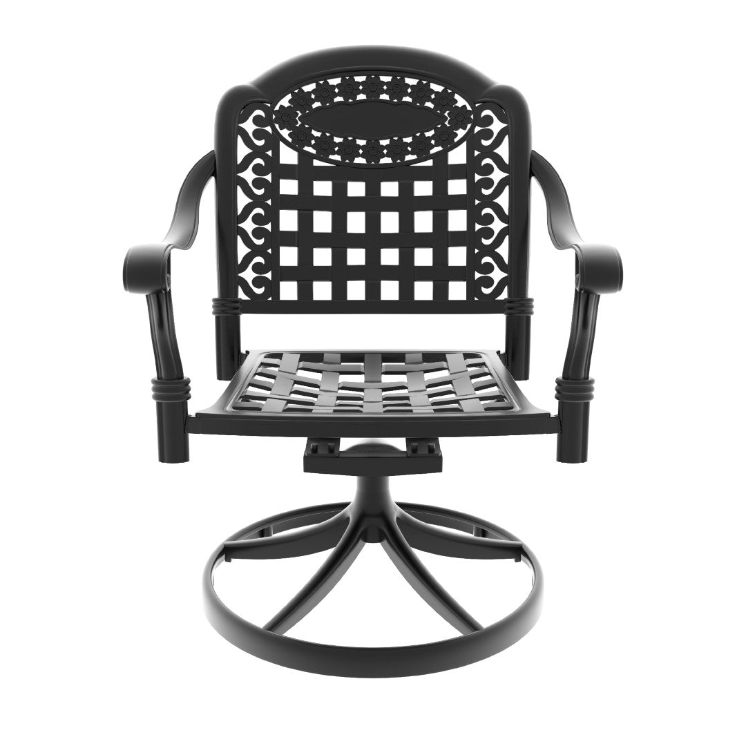 Enjoy outdoor dining with friends and family year-round with this durable 7-piece all-weather dining set. Built from cast aluminum with a sleek black finish, the set pairs a spacious round table with six comfortable swivel chairs—each with plush cushions—to blend sturdy performance with refined style. Ideal for patios, decks, or poolside entertaining, the set is engineered for stability, easy maintenance, and long-lasting comfort.