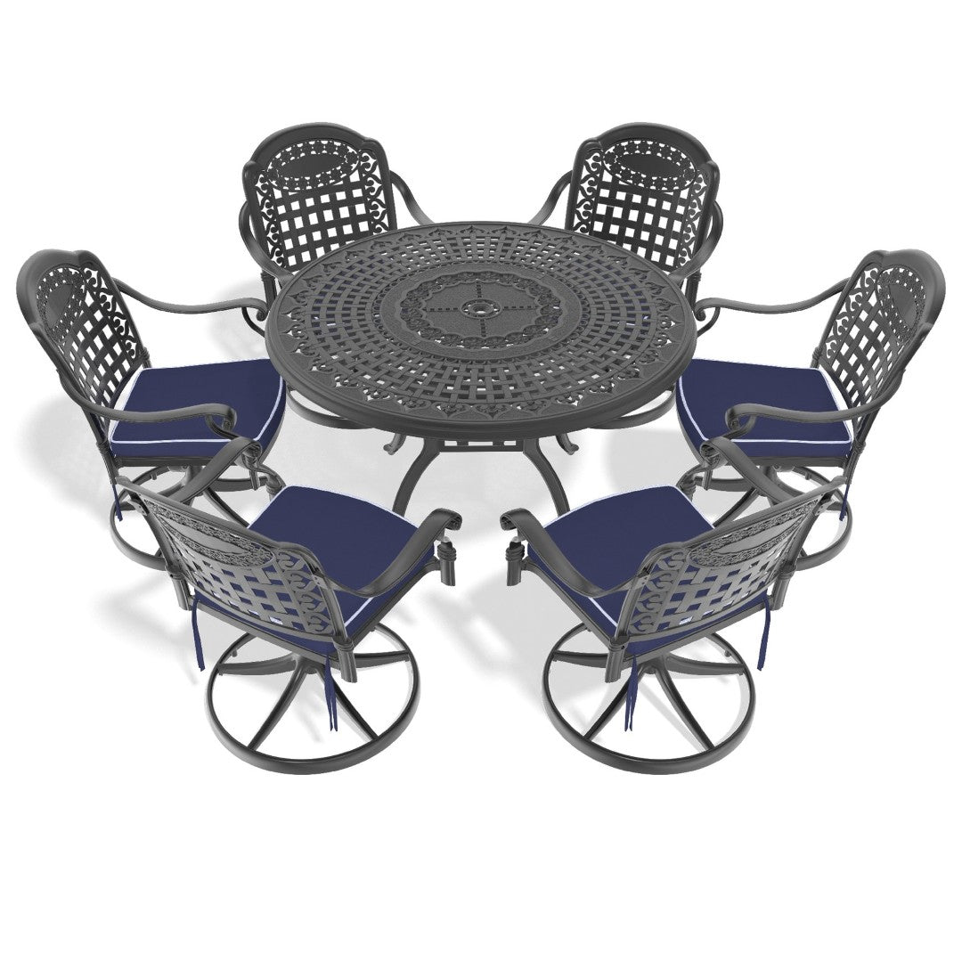 Elevate your outdoor dining experience with this durable 7-piece all-weather cast aluminum set. Designed for style, comfort, and low maintenance, the set includes a spacious round dining table and six swivel chairs with cushions—perfect for family meals or entertaining guests on patios, decks, and poolside areas. The black cast aluminum frame resists rust and weathering, while the swivel chairs provide easy access and flexible seating. Quick to assemble with all tools included, this set balances sturdiness and elegant design for long-lasting outdoor use.