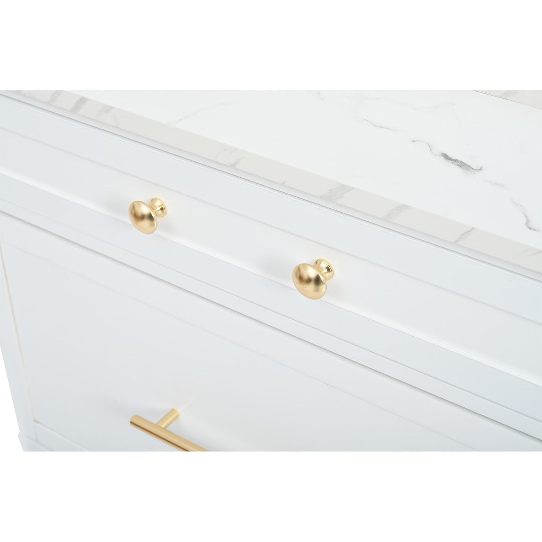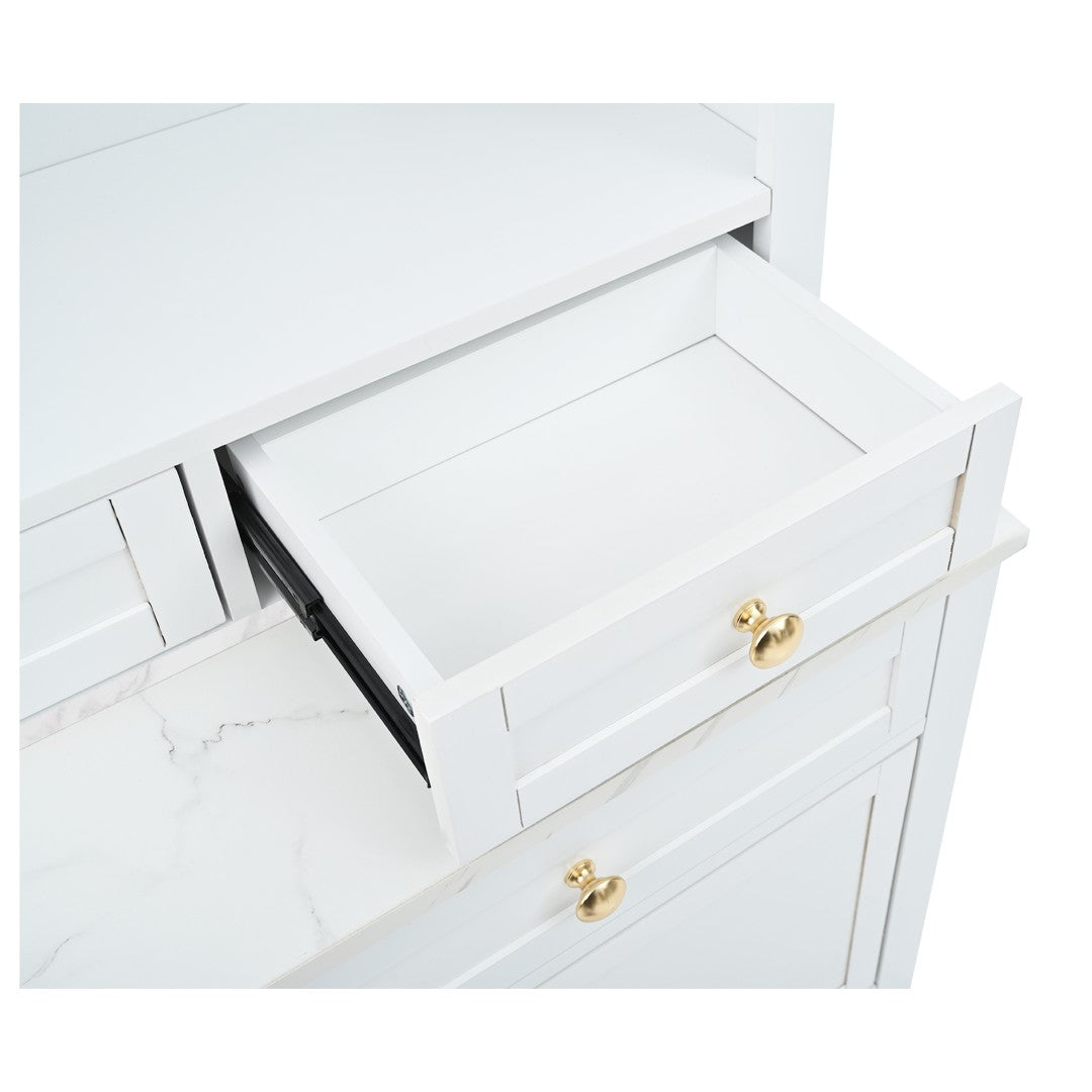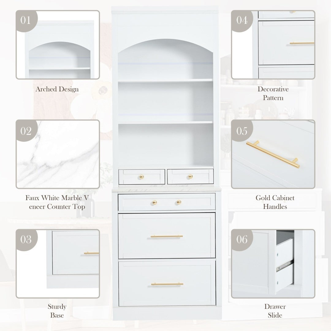 - [Luxurious Faux Marble Countertop]Featuring a 35.4-inch faux white marble top, this cabinet introduces elegance and utility to your kitchen or dining area. The counter-height design offers a practical prep surface for a space to display appliances and decor. Its smooth, easy-to-clean finish combines beauty with functionality, elevating modern interiors effortlessly.